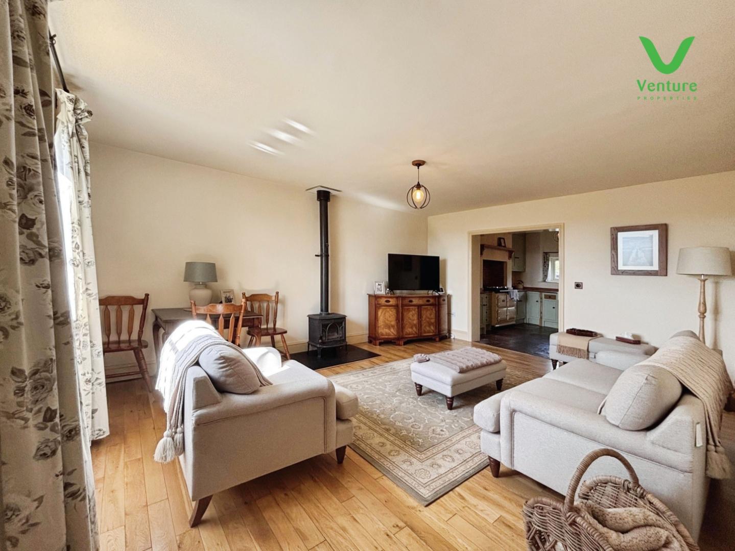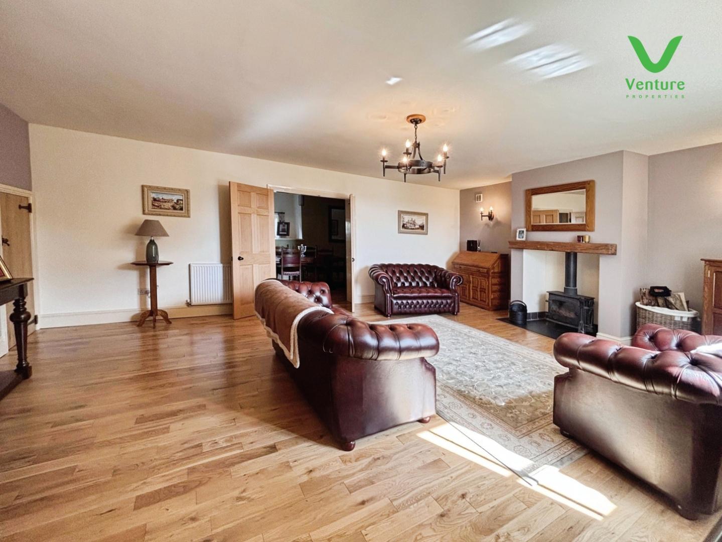 Feature timber mantle, inset multi fuel stove, granite hearth, oak flooring, tv point, wall light points, two central heating radiators. UPVC double glazed window to the front elevation