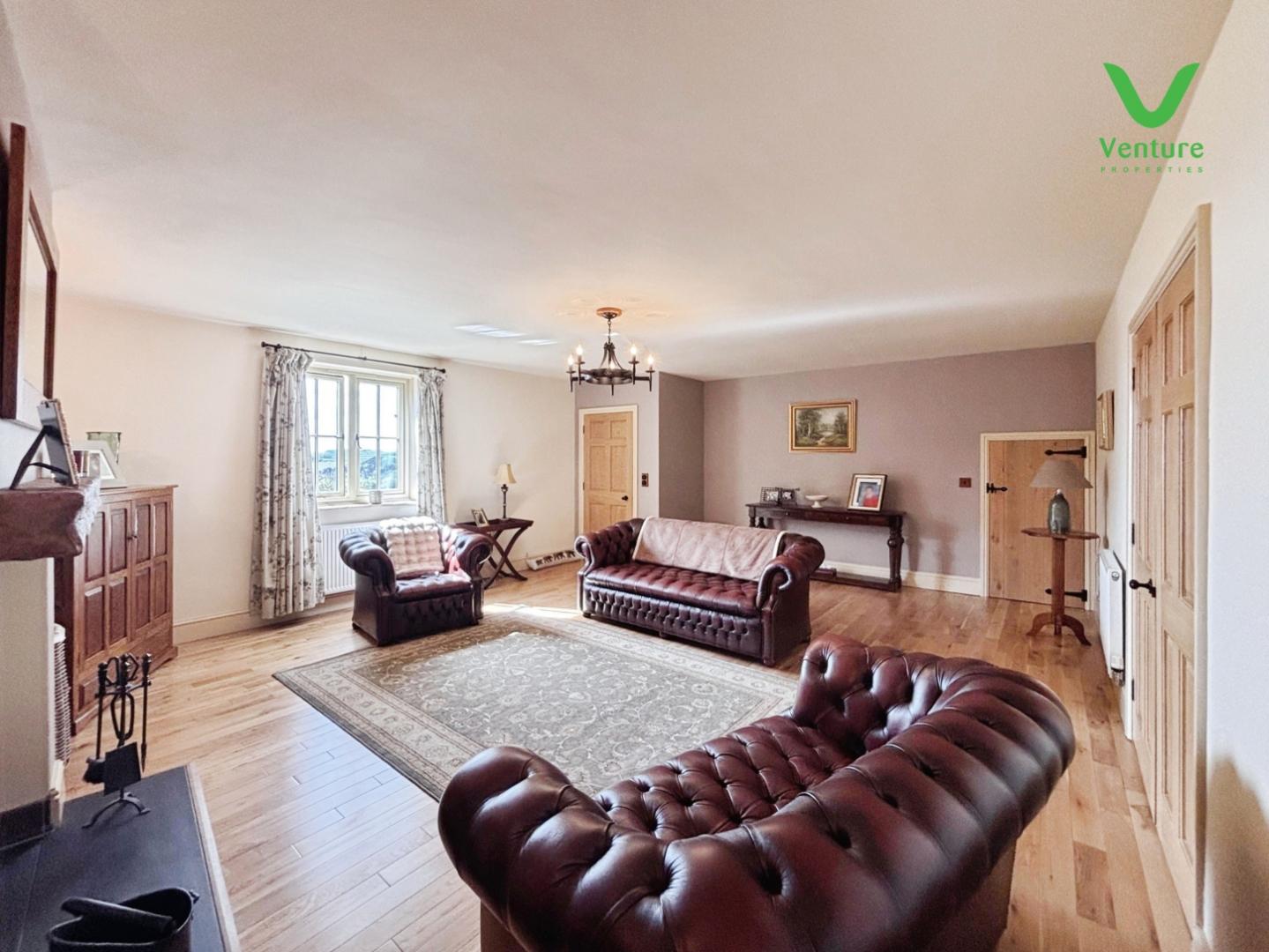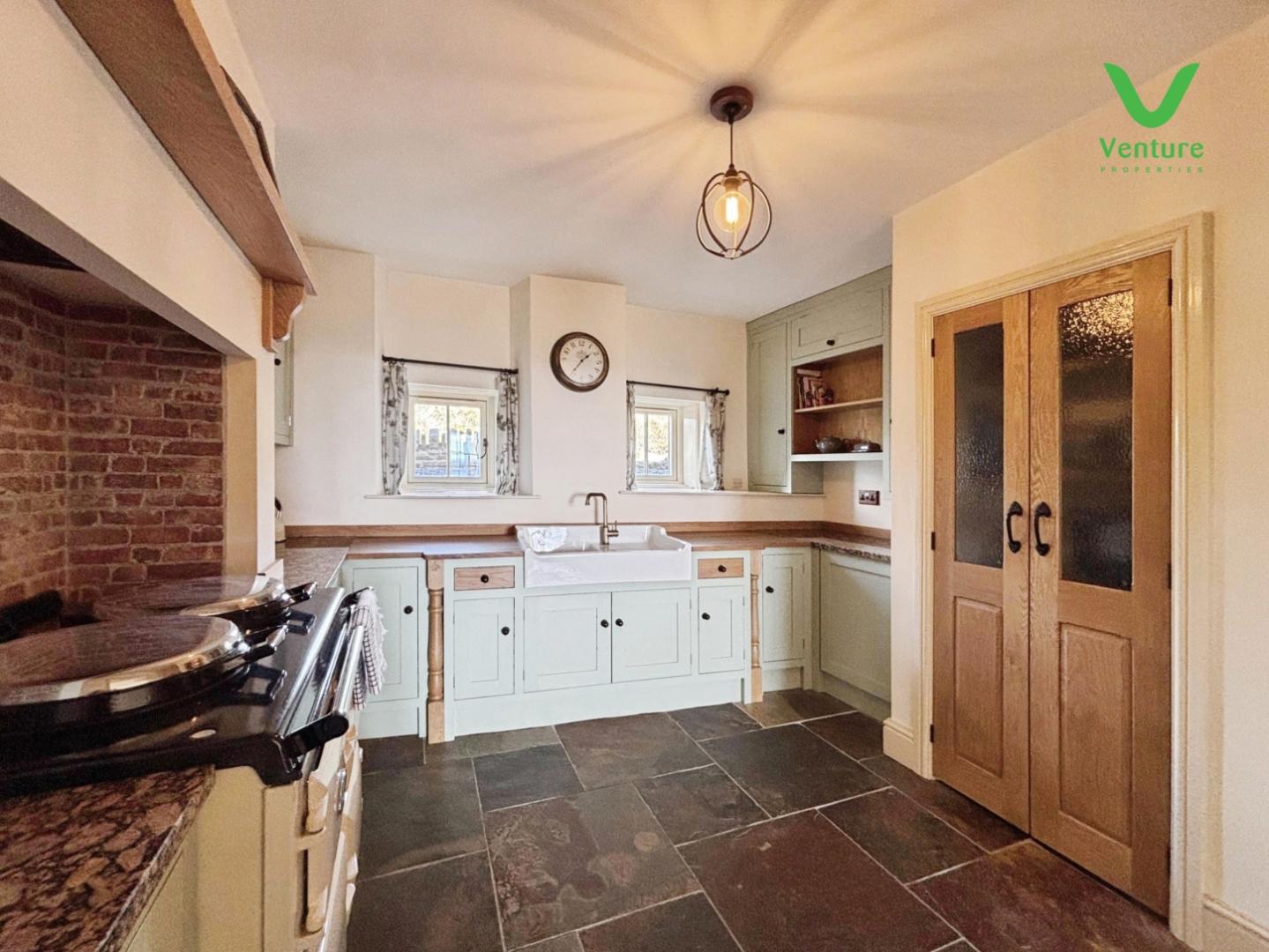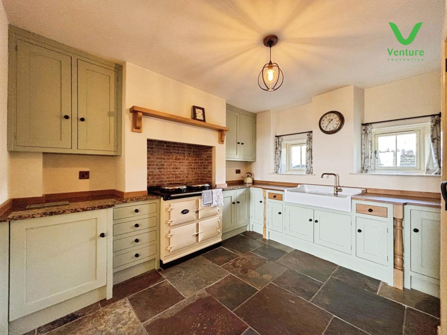 Extensively fitted with a Staples Woodcraft Bespoke farmhouse style kitchen including wall and base units, granite and oak timber work surfaces, inset butler sink unit and mixer tap, UPVC double glazed window to the rear elevation, larder cupboard, slate floor, fitted electric Aga for cooking.