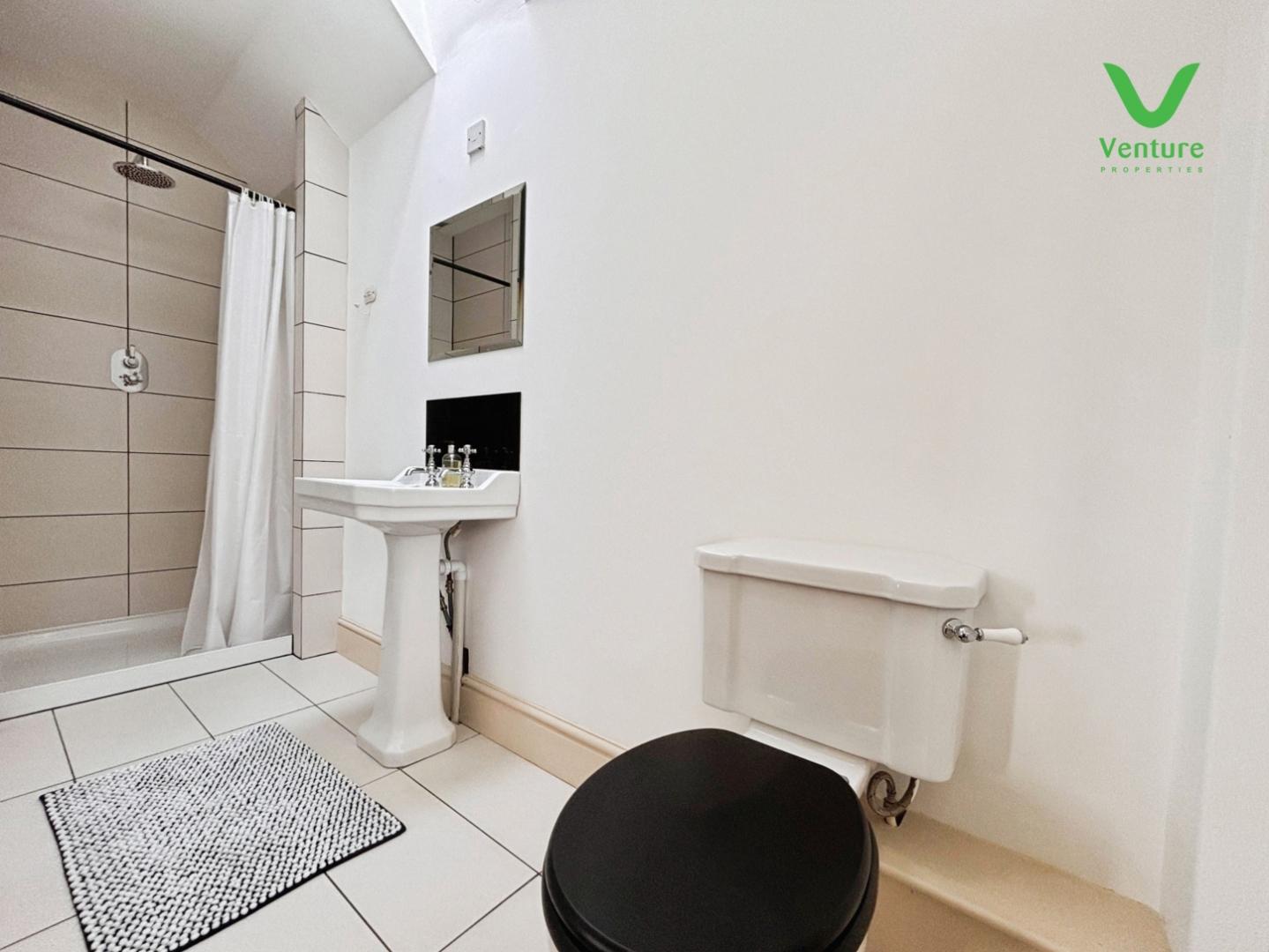 Walk in shower being tiled with mains shower, pedestal wash hand basin, wc, heated towel rail fitted wall mirror, velux window light