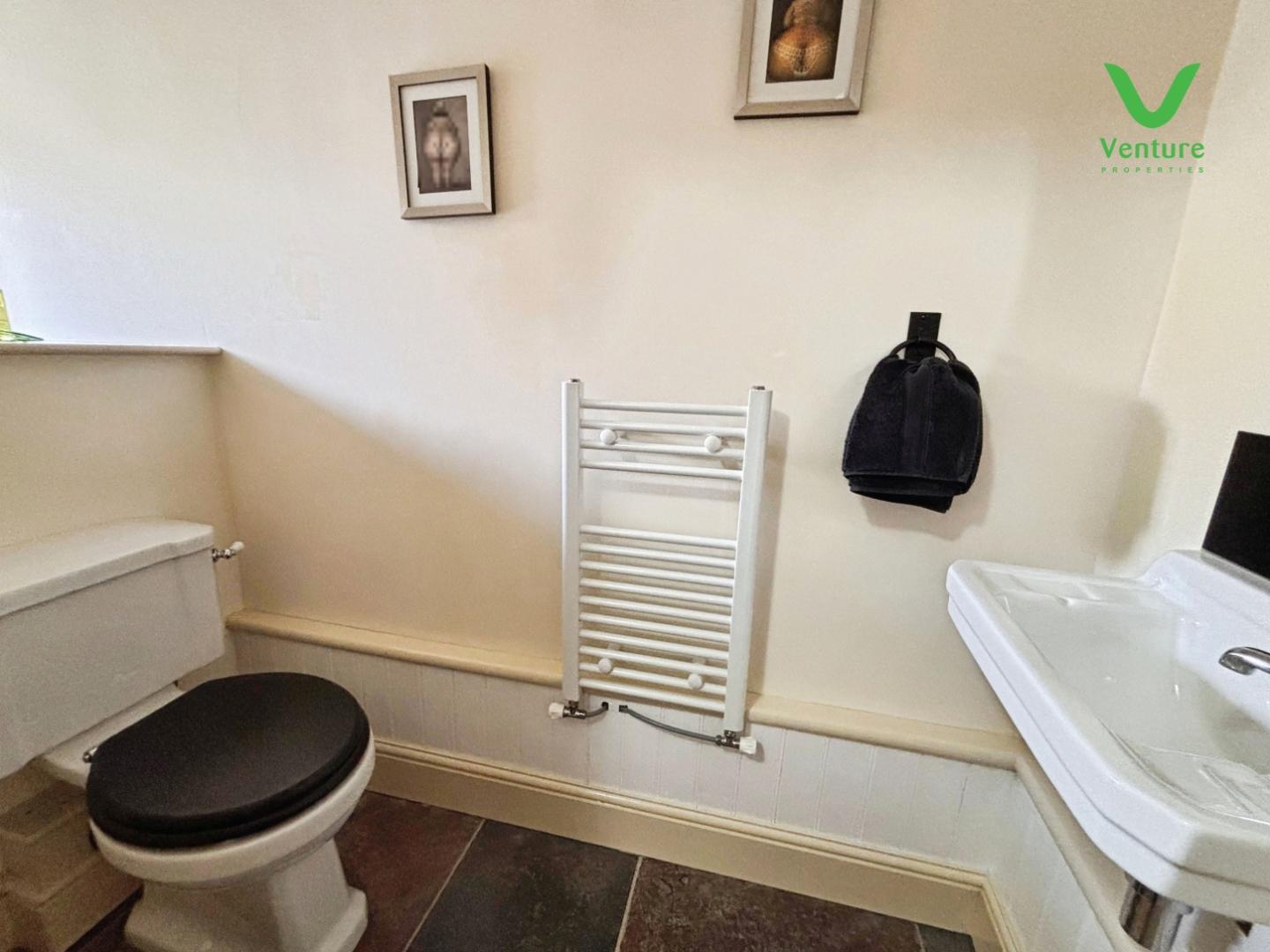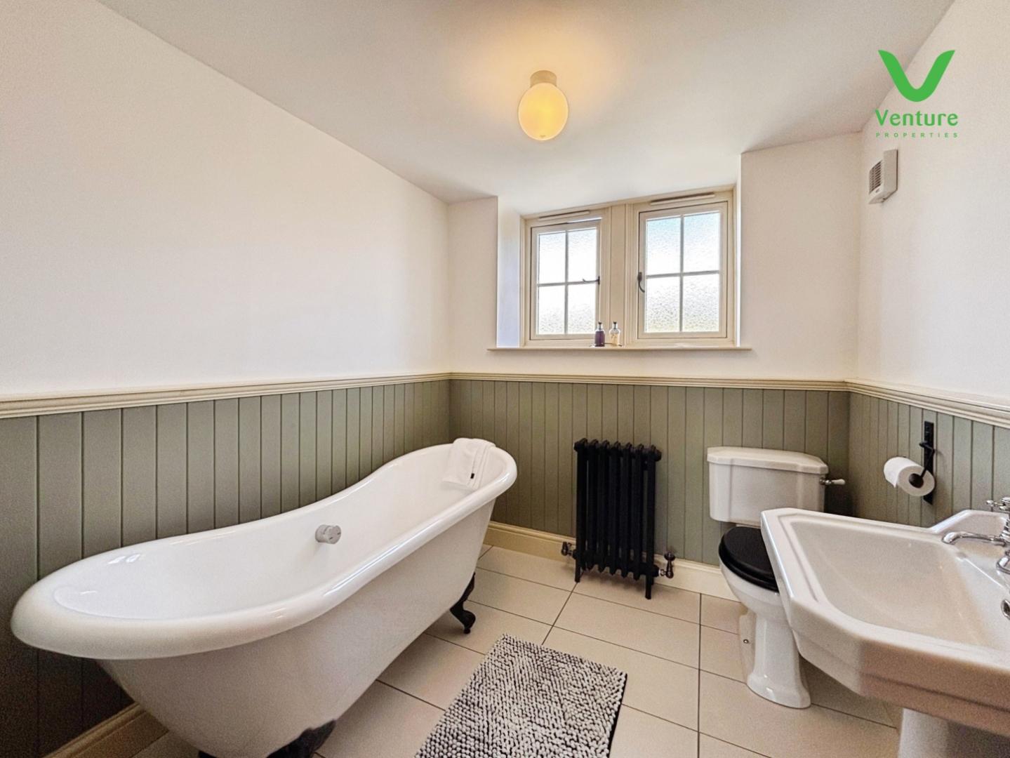 Extensively fitted with a white free standing clawfoot bath, wc, pedestal wash hand basin, panelling to half height, cast radiator, tiled floor and opaque UPVC double glazed window