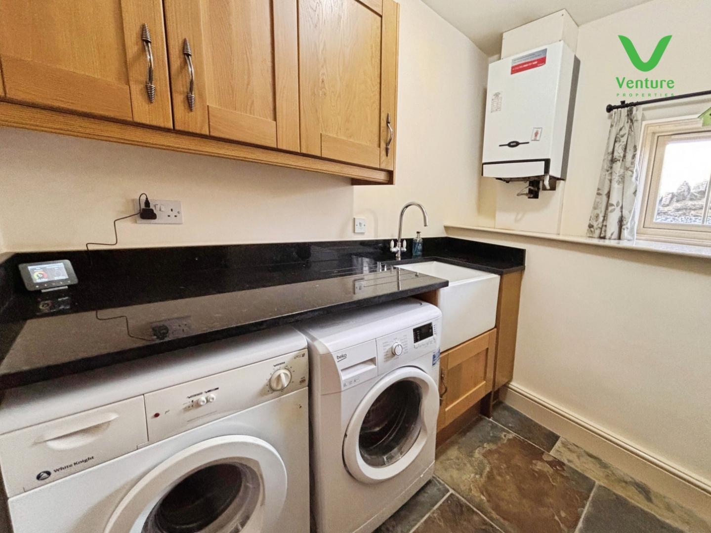 With a range of base units, inset butler sink unit and mixer tap over, UPVC double glazed window, slate floor, central heating radiator, wall mounted gas boiler, plumbing and space for washing machine. Access to: