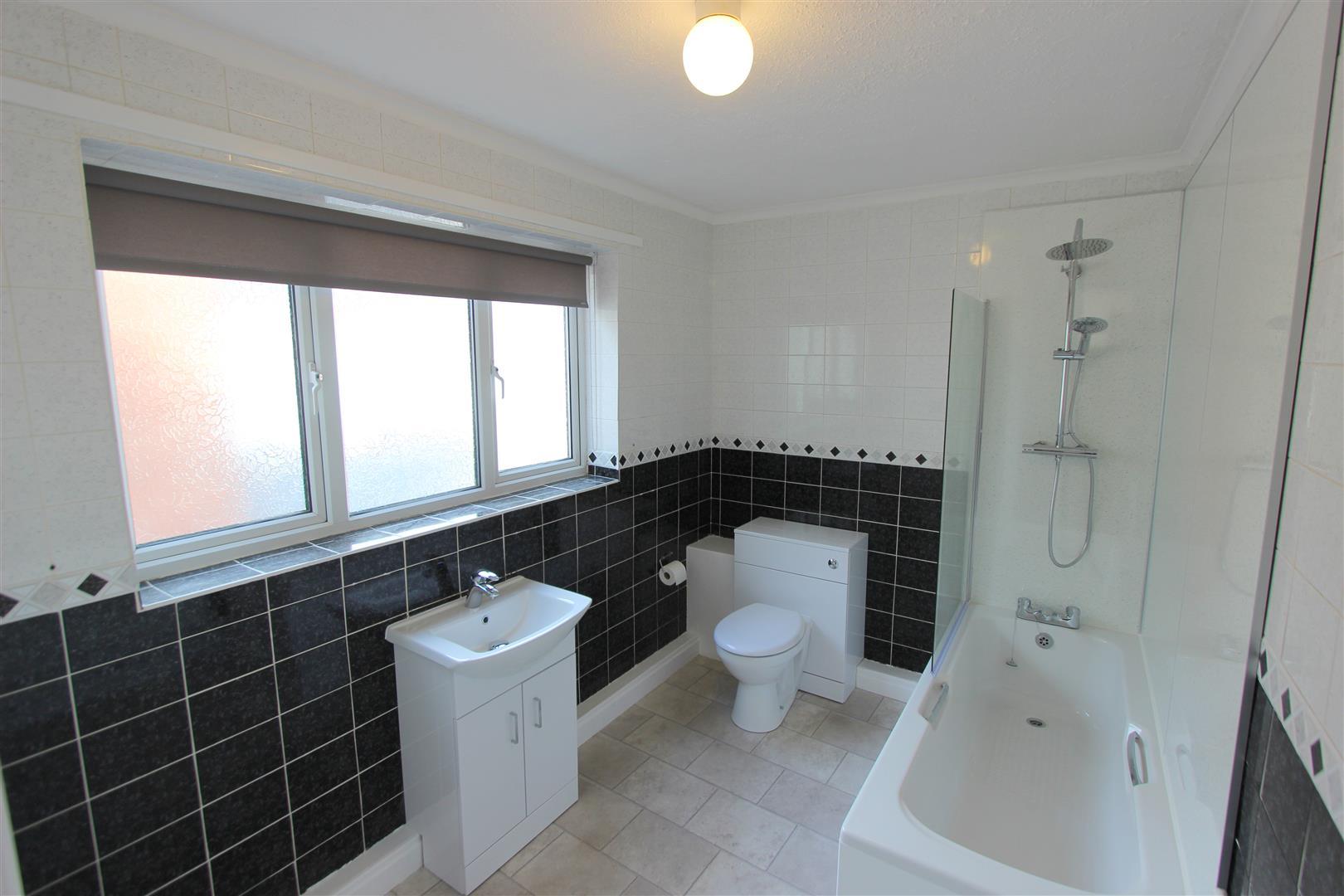 Large bathroom with brand new white suite comprising WC, hand basin with vanity unit and bath with double shower over and shower screen. Flooring is a contemporary tile-effect lino. There is also two large cupboards for extra storage, one of which houses the Worcester Bosch combi boiler. Single radiator and UPVC double glazed window.