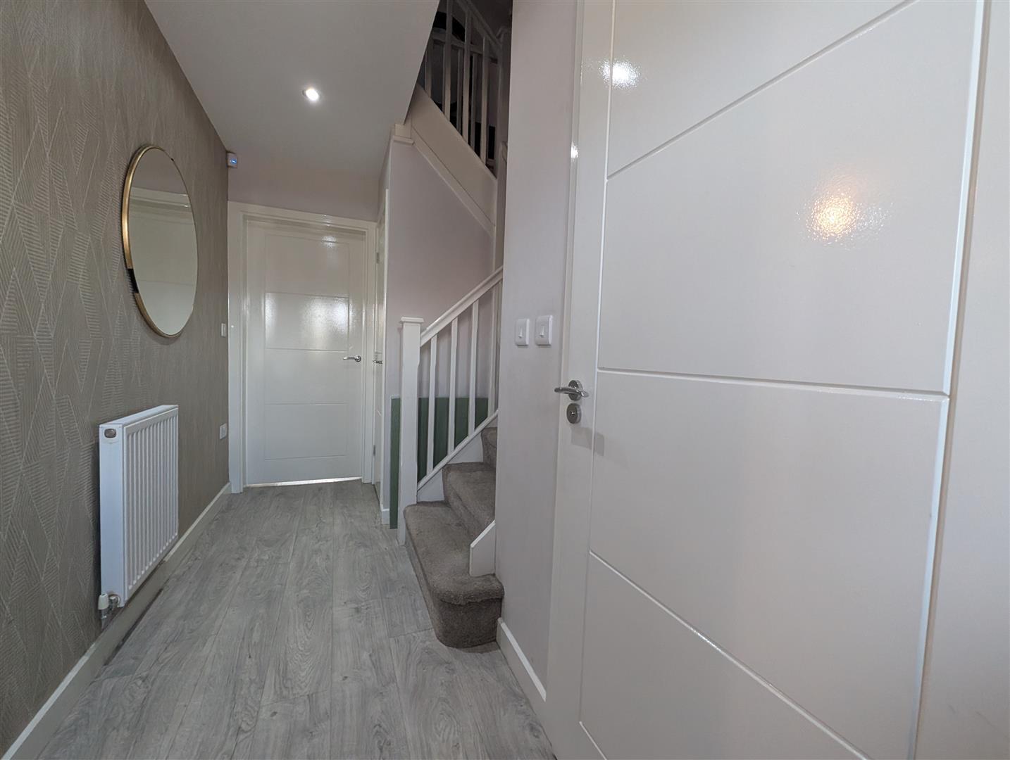 Door to front and staircase to first floor landing with storage cupboard under. Spotlights to ceiling and radiator.