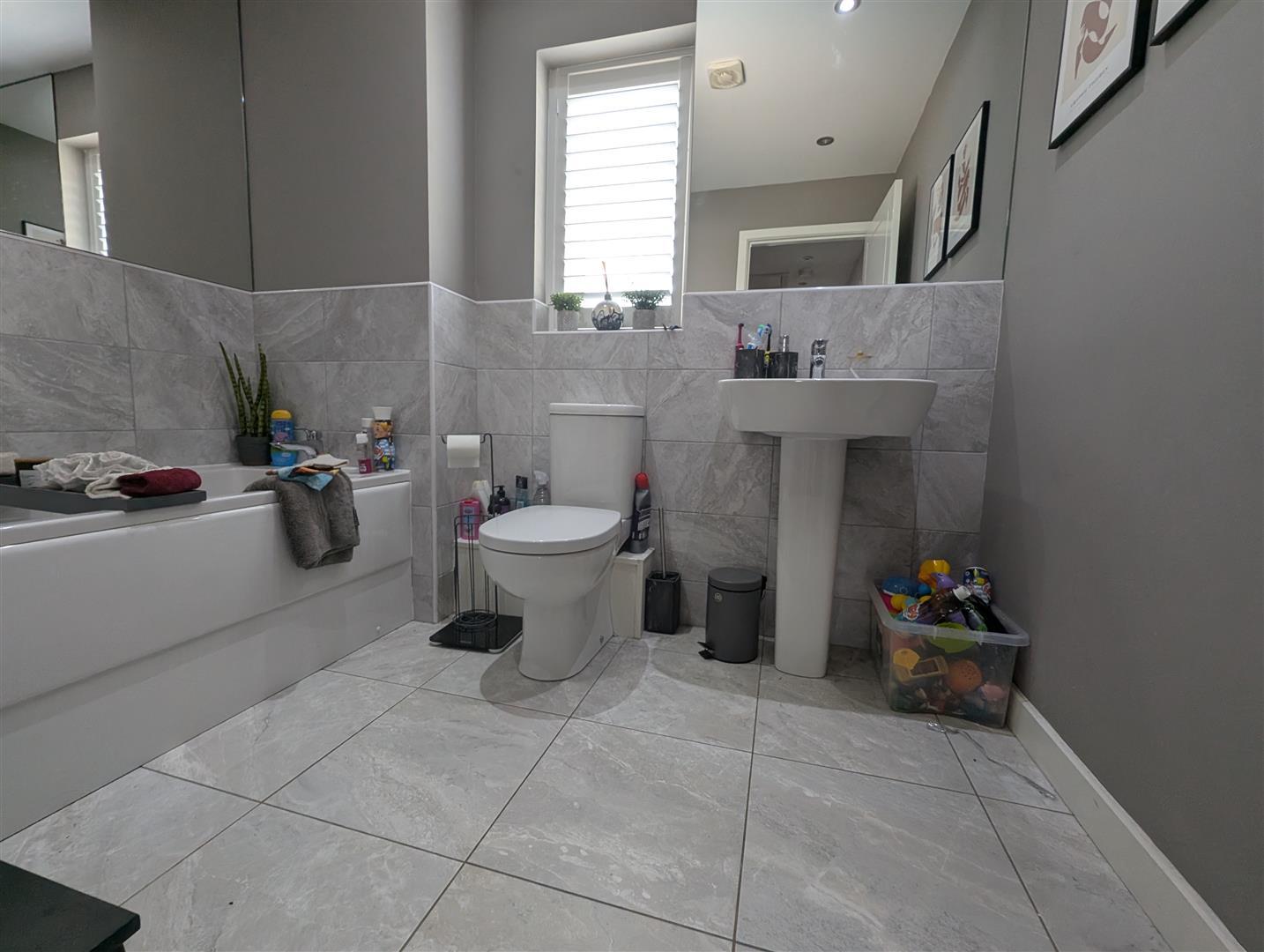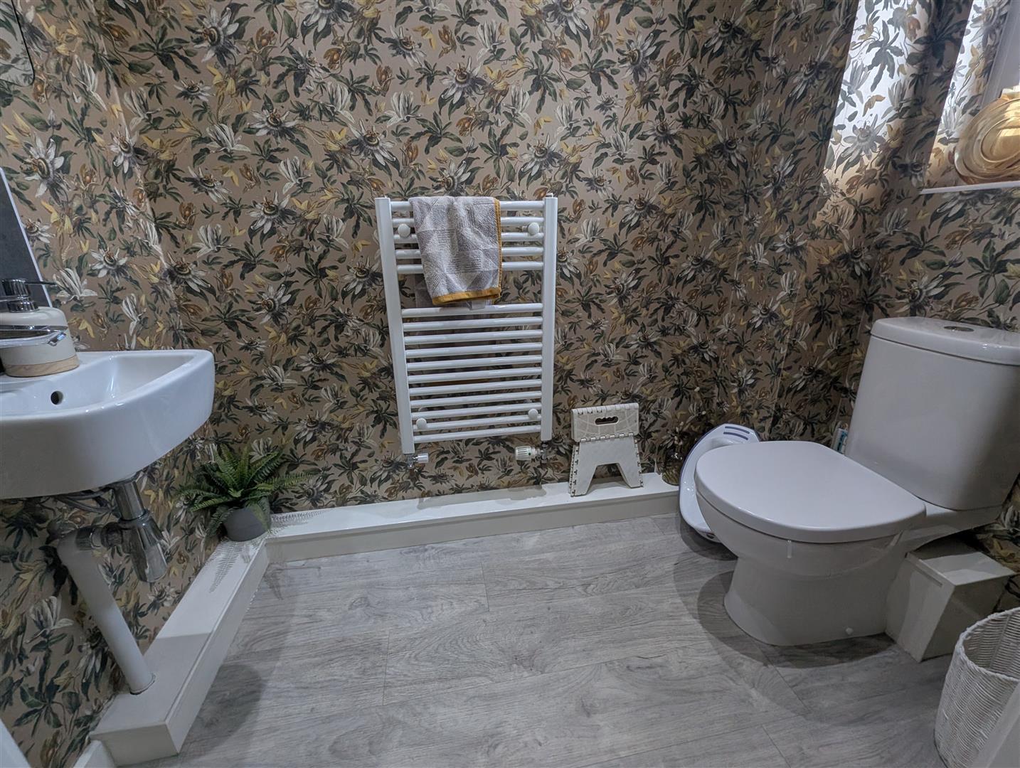 Upvc double glazed window to front, low level w.c, wash hand basin and heated towel rail.
