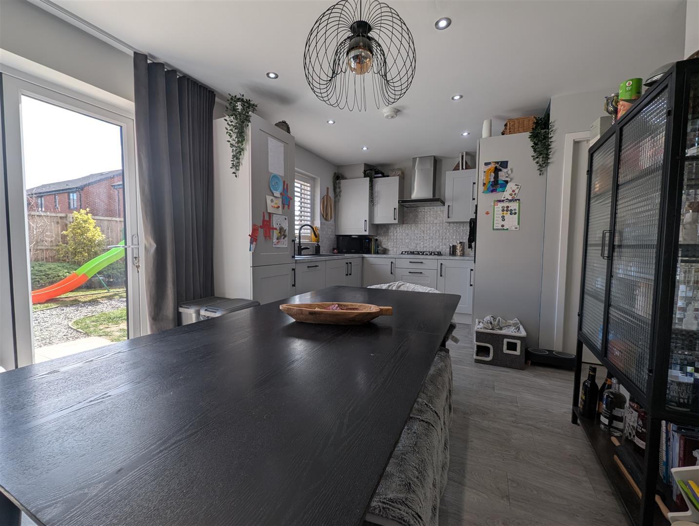 Upvc double glazed window and triple bi-fold doors to rear. Fitted with wall, base and drawer units, matt black composite sink with mixer tap, gas hob with extractor over and eye level oven. Integrated fridge freezer and dishwasher. Spotlights to ceiling and open aspect to diner area where there is space for a dining table and chairs and a breakfast bar option for casual seating. Radiator.