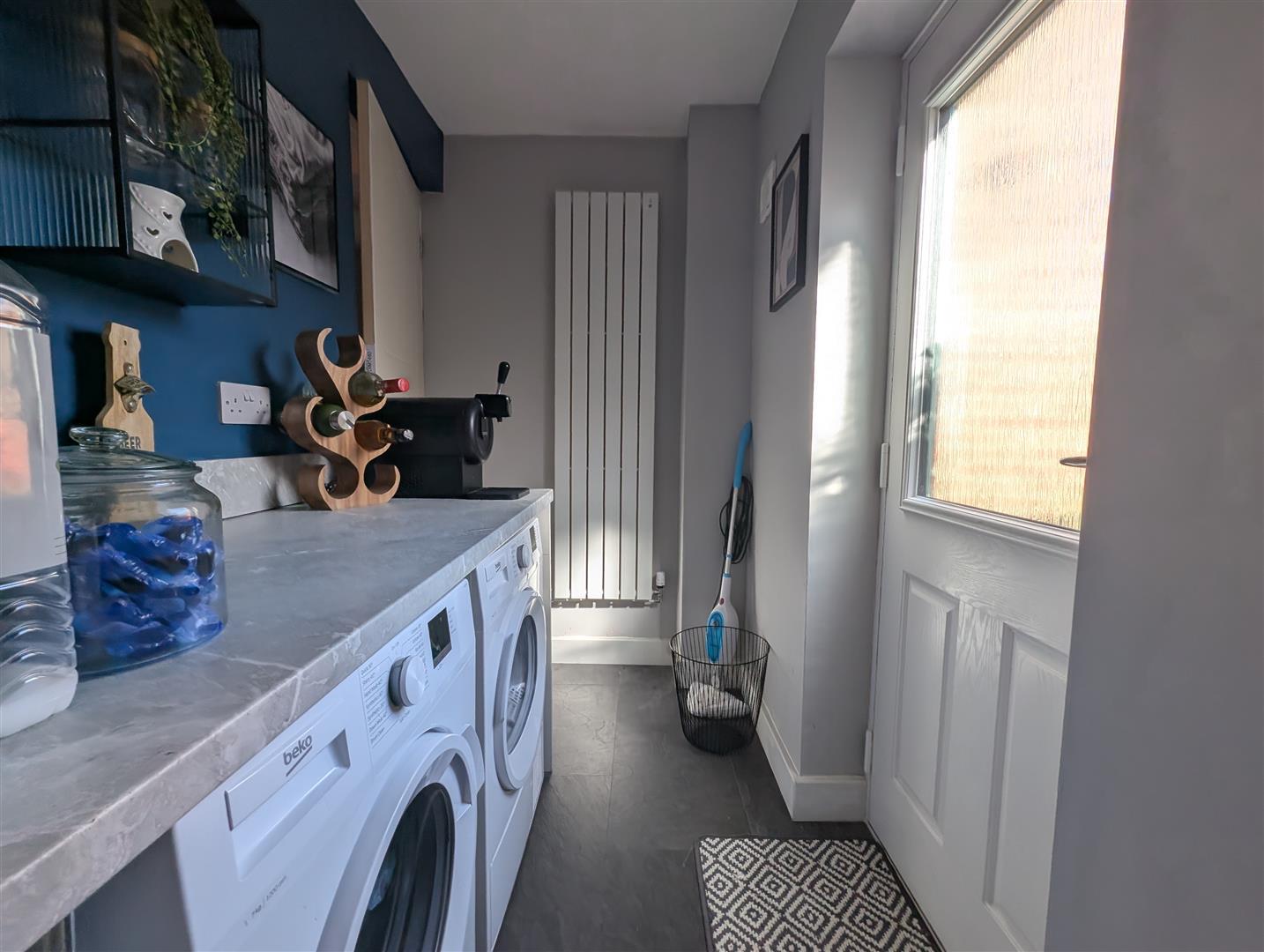 Upvc door to rear garden, fitted worktop with space for washing machine and tumble dryer under. Space for a fridge freezer, vertical radiator.