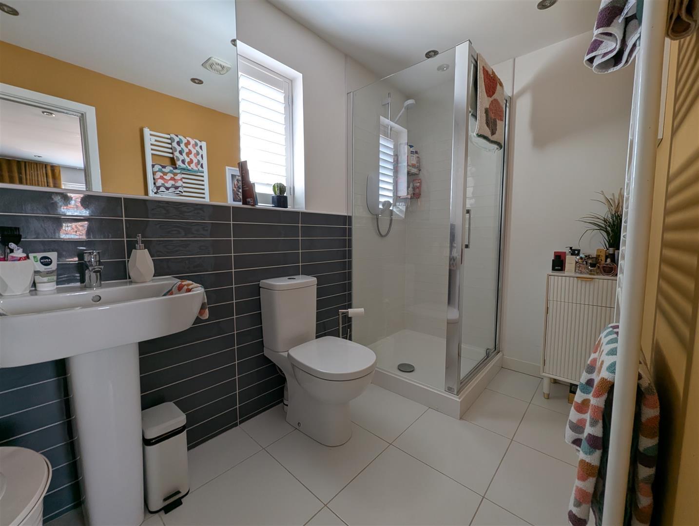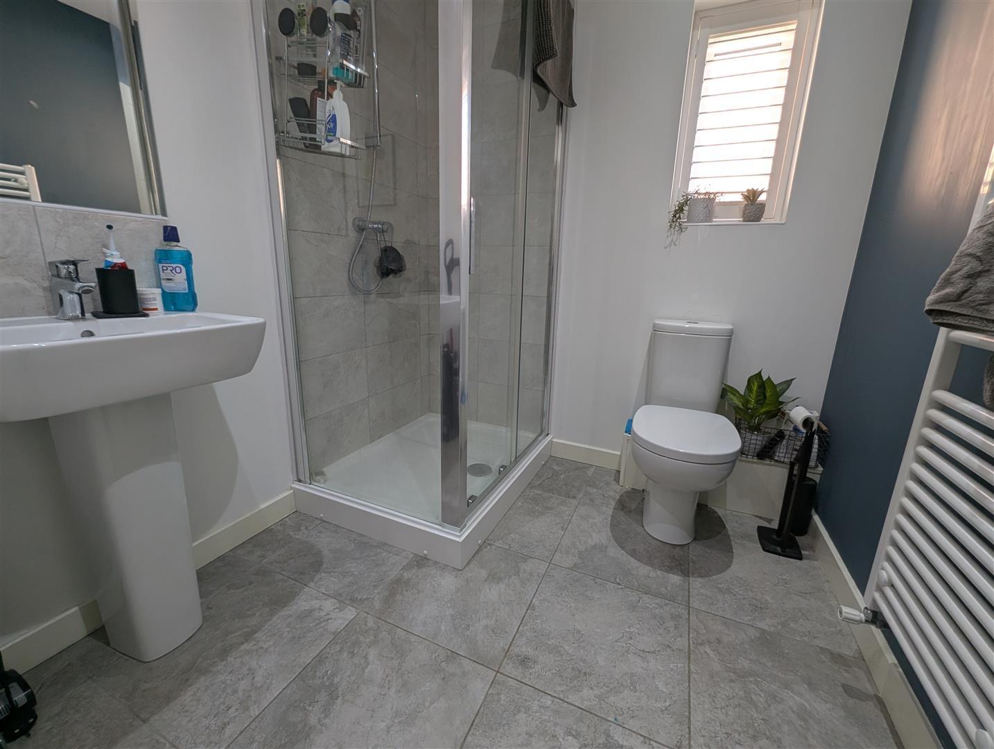 Upvc double glazed obscure window to front, shower cubicle, wash hand basin and low level w.c. Spotlights to ceiling and heated towel rail.