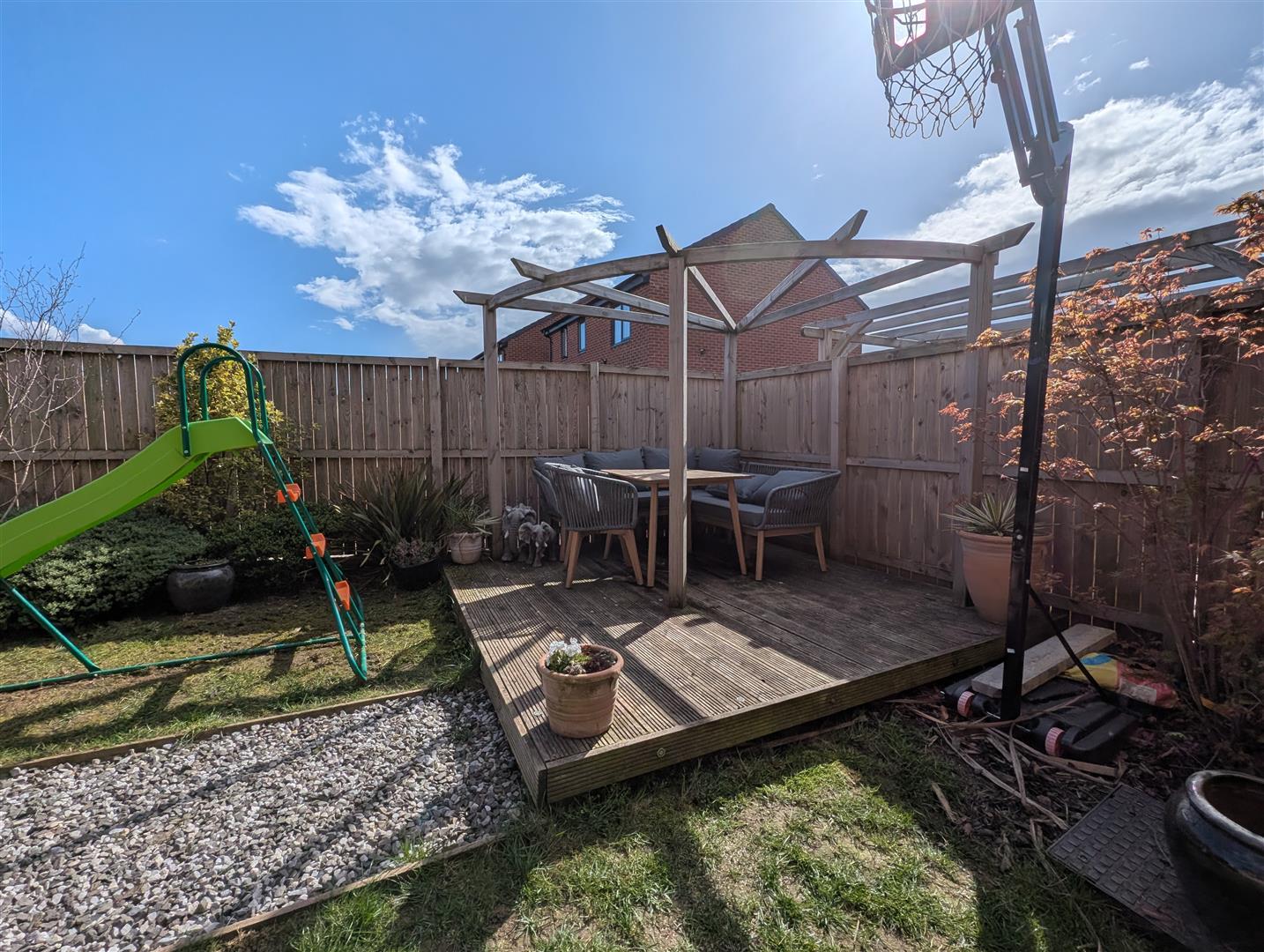 To the rear is an enclosed, generous landscaped garden with pergola feature on raised decking, a patio area and part lawn part gravelled areas. Borders with established shrubs and plants.