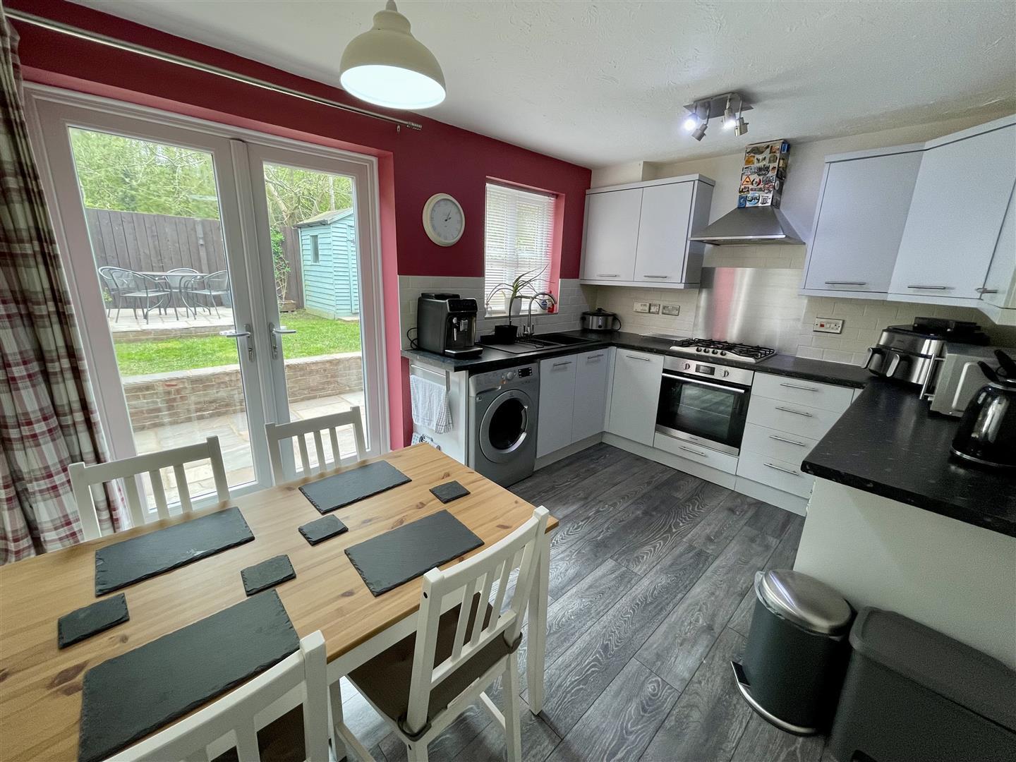 Upvc double glazed window to rear and French doors to rear. Fitted range of medium oak wall, base and drawer units with contrasting work surfaces. Stainless steel sink unit with mixer taps, four ring gas hob and oven with extractor over, space for fridge and freezer, space for washing machine, space for table and chairs. part tiled walls and laminate floor.