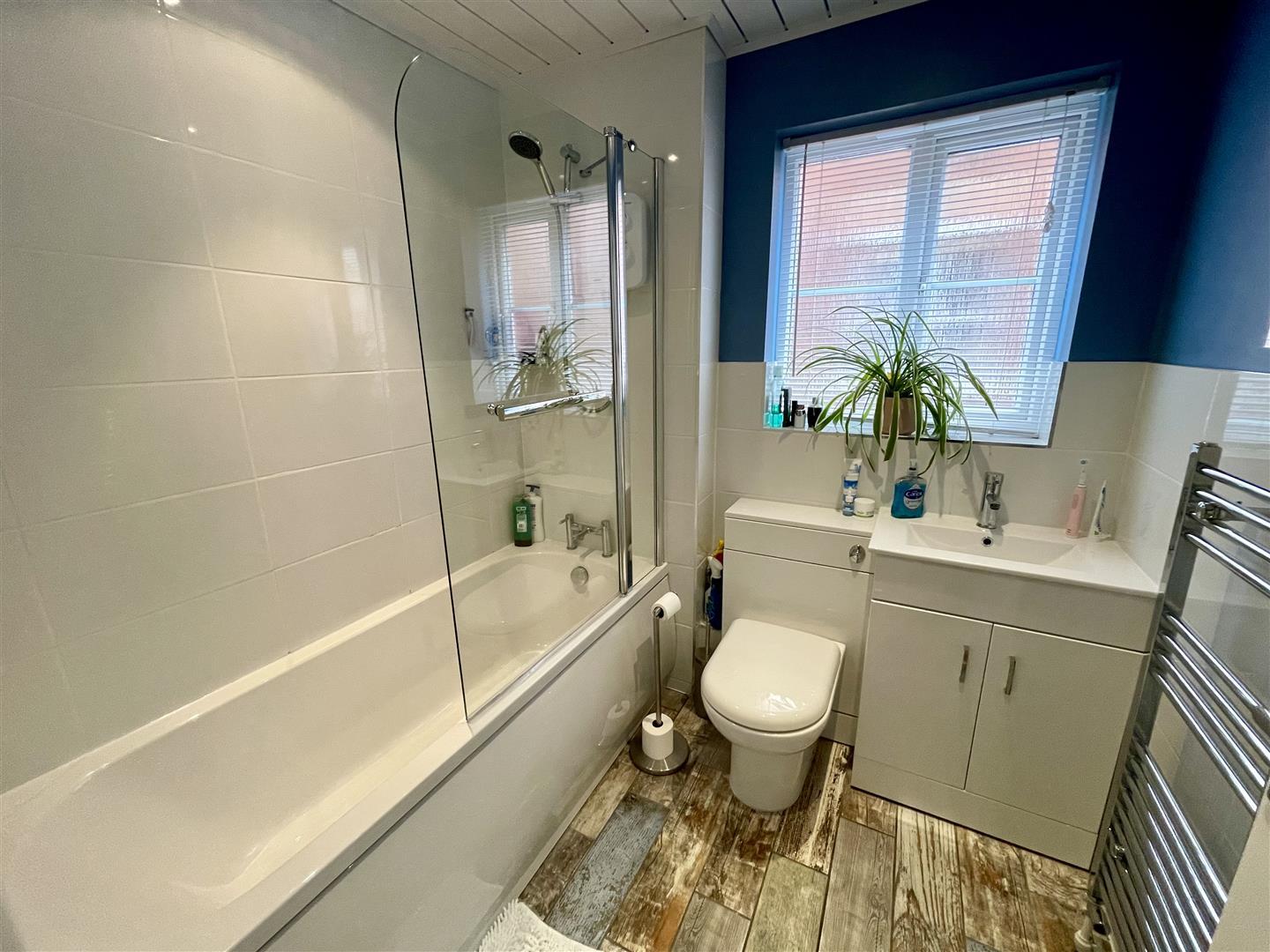 Upvc double glazed obscure window to side, panelled bath with shower over and screen, wash hand basin and low level w.c in vanity unit, tiled flooring, heated towel rail and extractor fan.