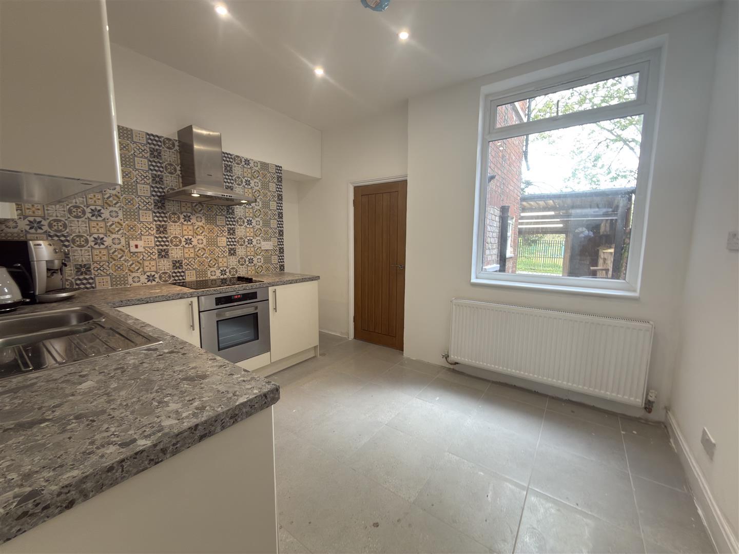 Upvc double glazed window to rear, fitted wall, base and drawer units, stainless steel sink, electric hob and oven with extractor over. Integrated dishwasher and space for a fridge/freezer. Staircase to first floor landing and radiator.