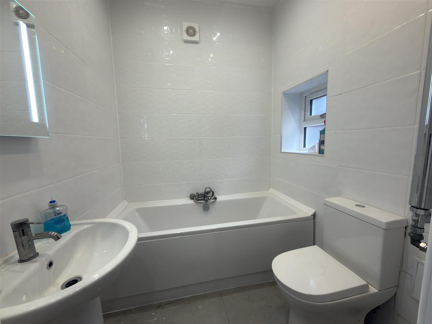 Upvc double glazed obscure window to rear, bath, wash hand basin, w.c and heated towel rail.
