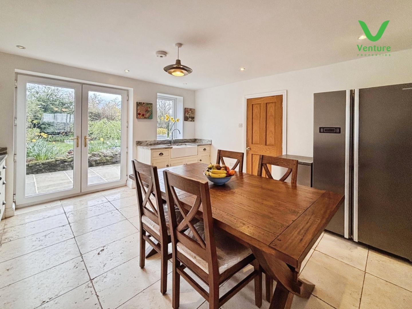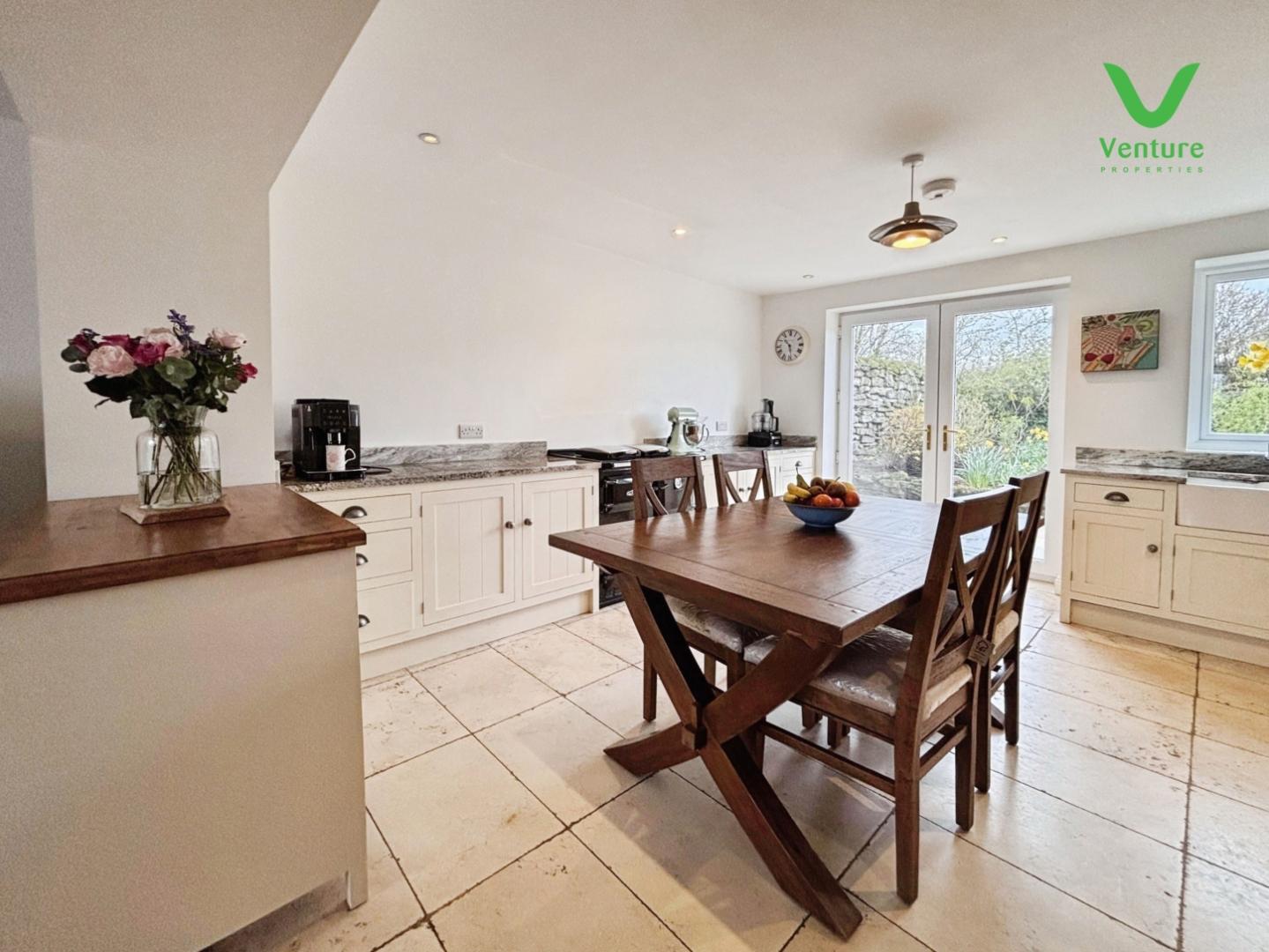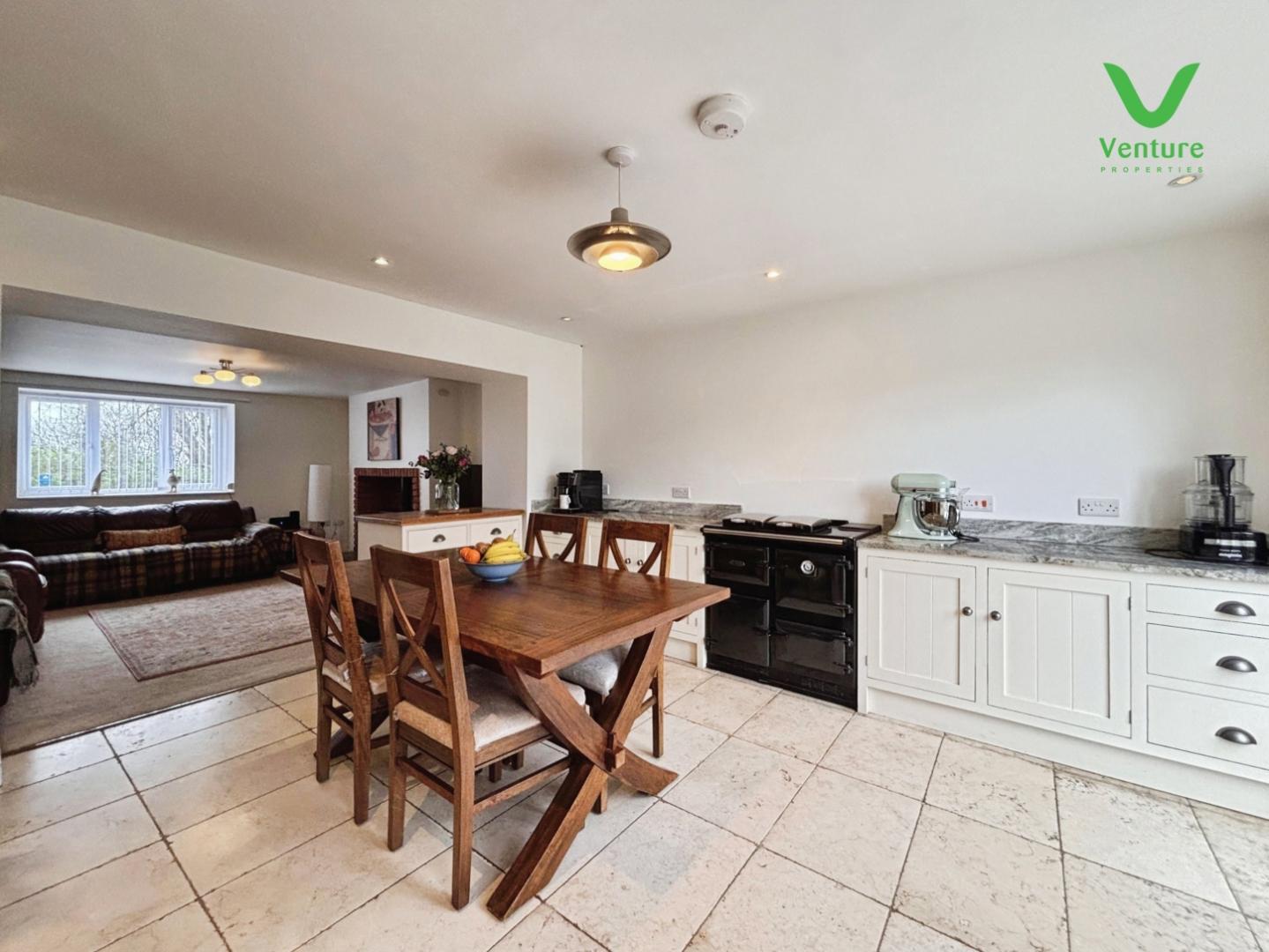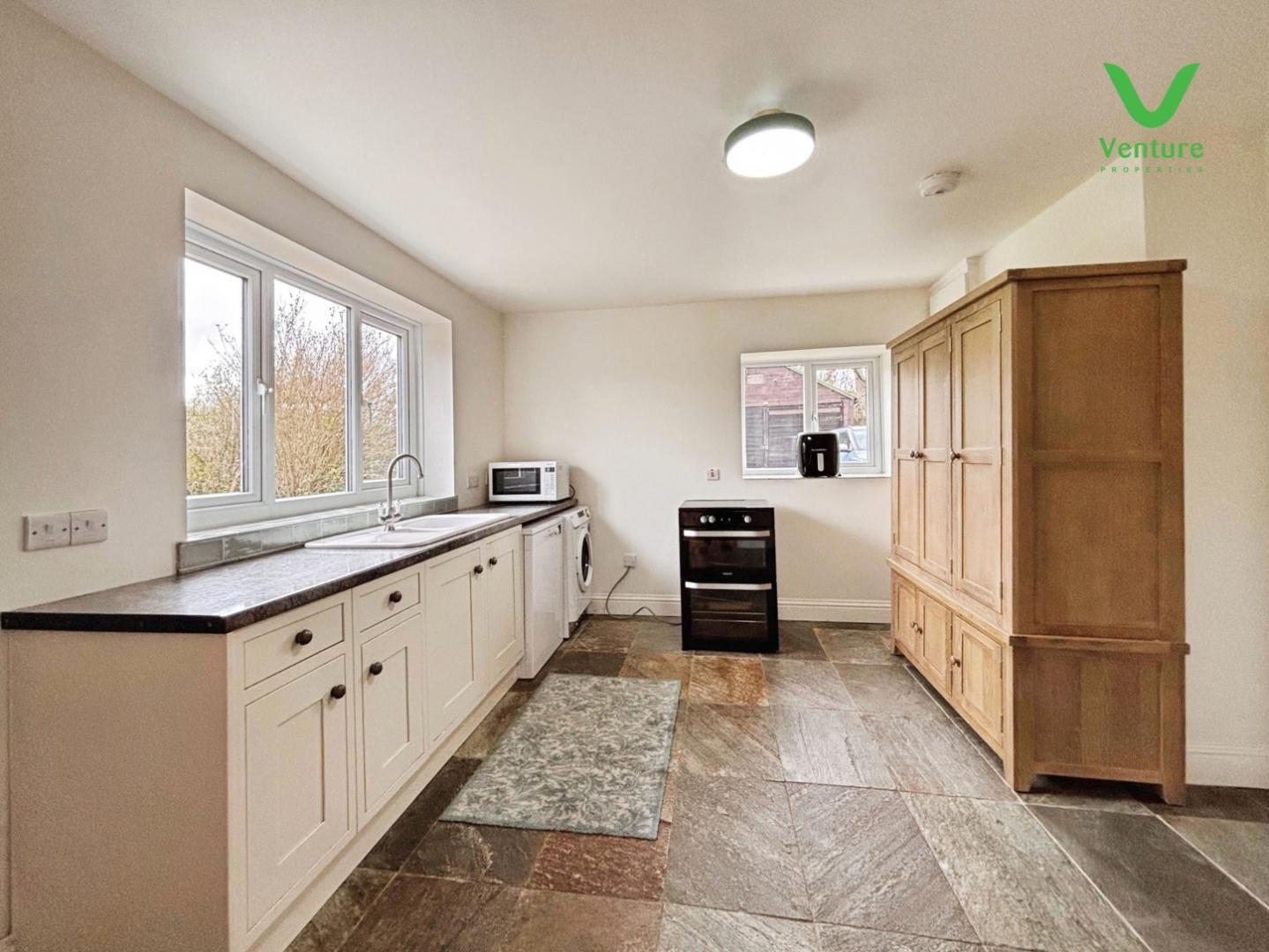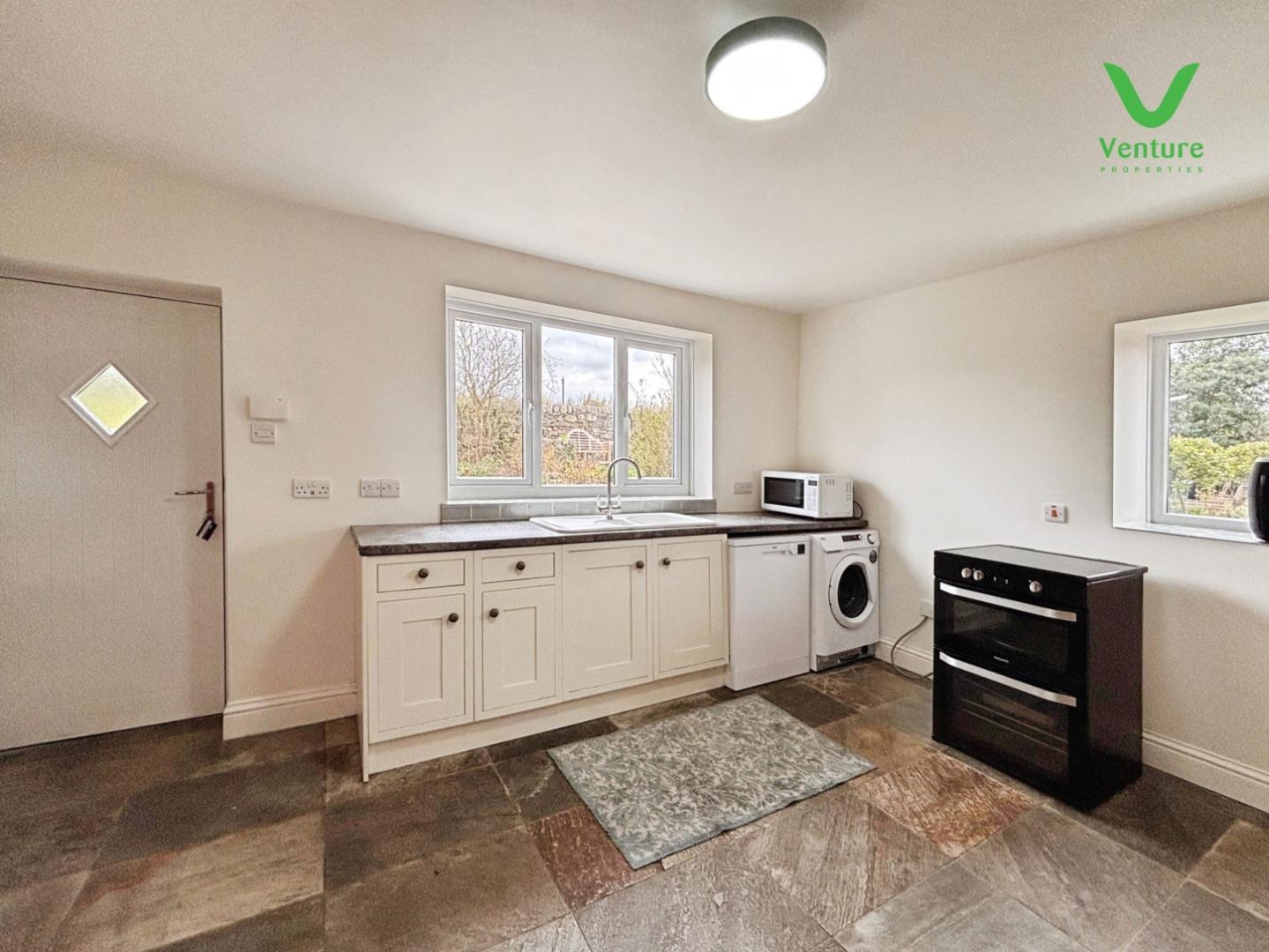 Fitted with base units having contrasting work surfaces over, ceramic sink unit, plumbing for washing machine and space for tumble dryer, dishwasher, central heating radiator natural slate floor, two uPVC double glazed windows and door to rear.
