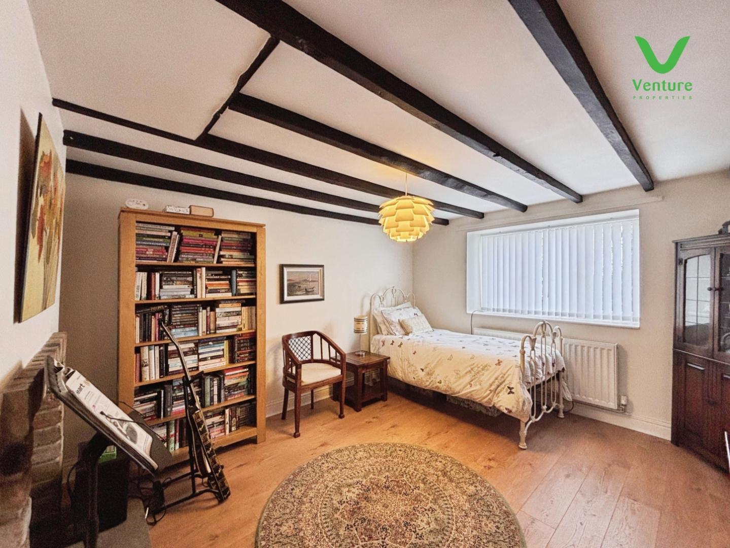With a feature brick fireplace, laminate wood flooring, beamed ceiling, access to understair cupboard and uPVC double glazed window to front.
