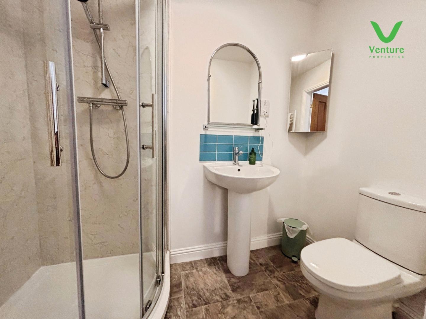 Fitted with a corner shower unit having mains shower over, wc, wash hand basin and heated towel rail.