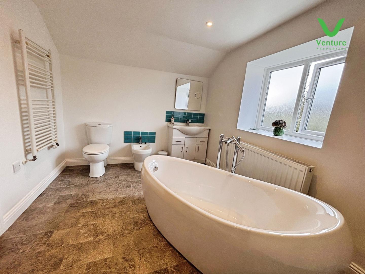 A good sized family bathroom fitted with a free standing bath, wc, wash hand basin set to vanity unit, bidet, corner shower unit and heated towel rail.