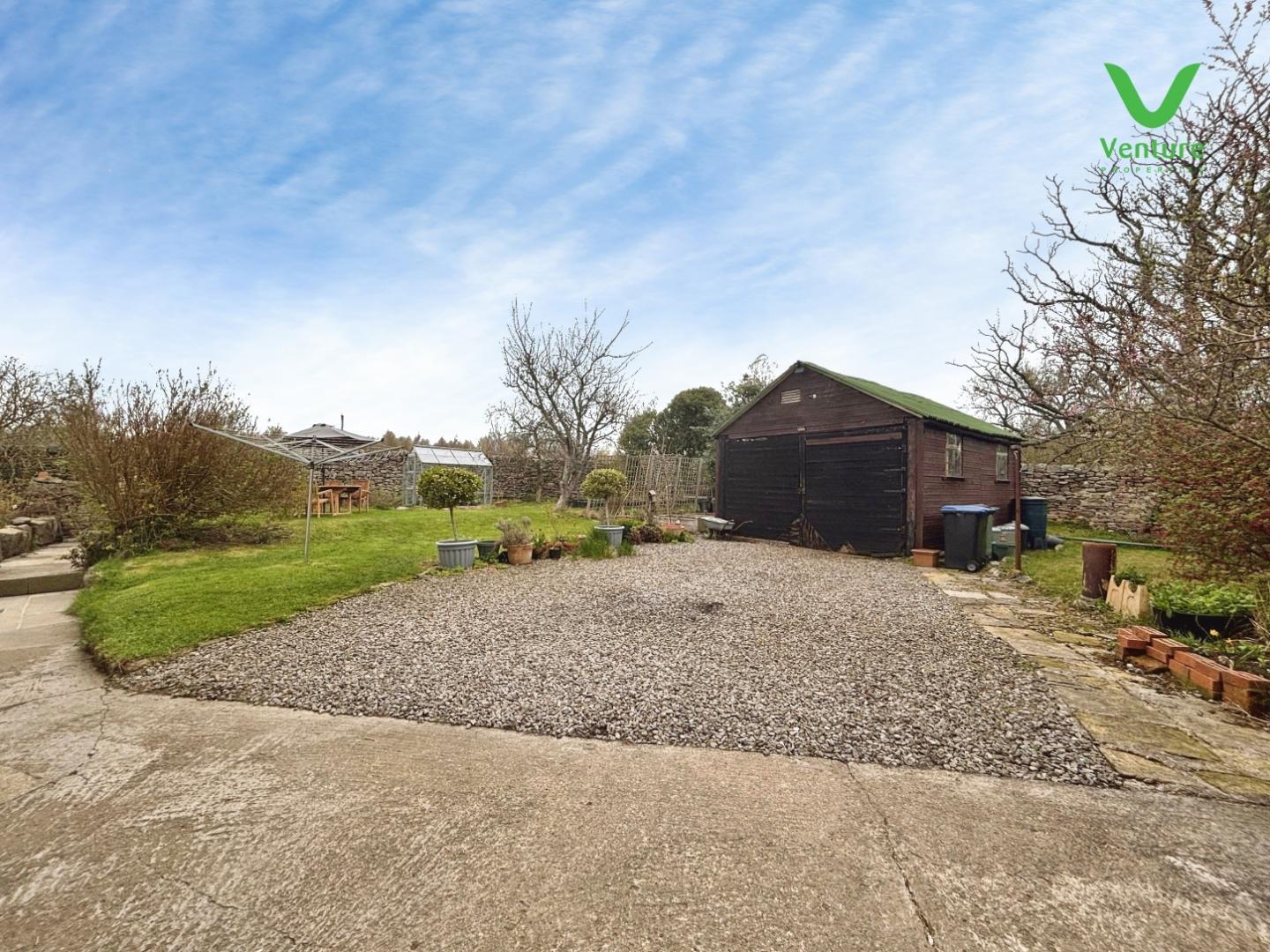Immediately to the front of the property there is a forecourt providing off street car parking for two vehicles. Double side timber gates lead to a large stone walled garden which is mainly laid to lawn with shrubs, flower borders, large driveway, a timber workshop, electric charging point and greenhouse.