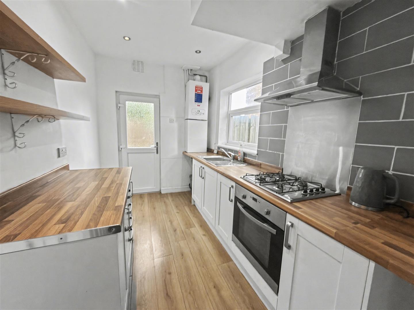 Upvc double glazed window to side, fitted with wall, base and drawer units, four ring gas hob with extractor over and oven. Stainless steel sink with mixer tap, space for a washing machine and fridge freezer. Door to rear.