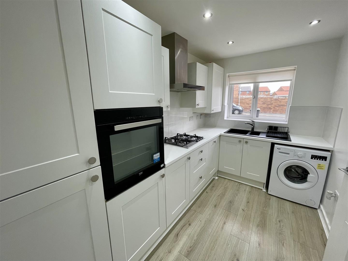 Upvc double glazed window to front, fitted with wall, base and drawer units, composite sink with mixer tap, four ring gas hob with extractor over and eye level oven. Integrated fridge freezer, dishwasher and washing machine. Spotlights to ceiling and laminate floor.
