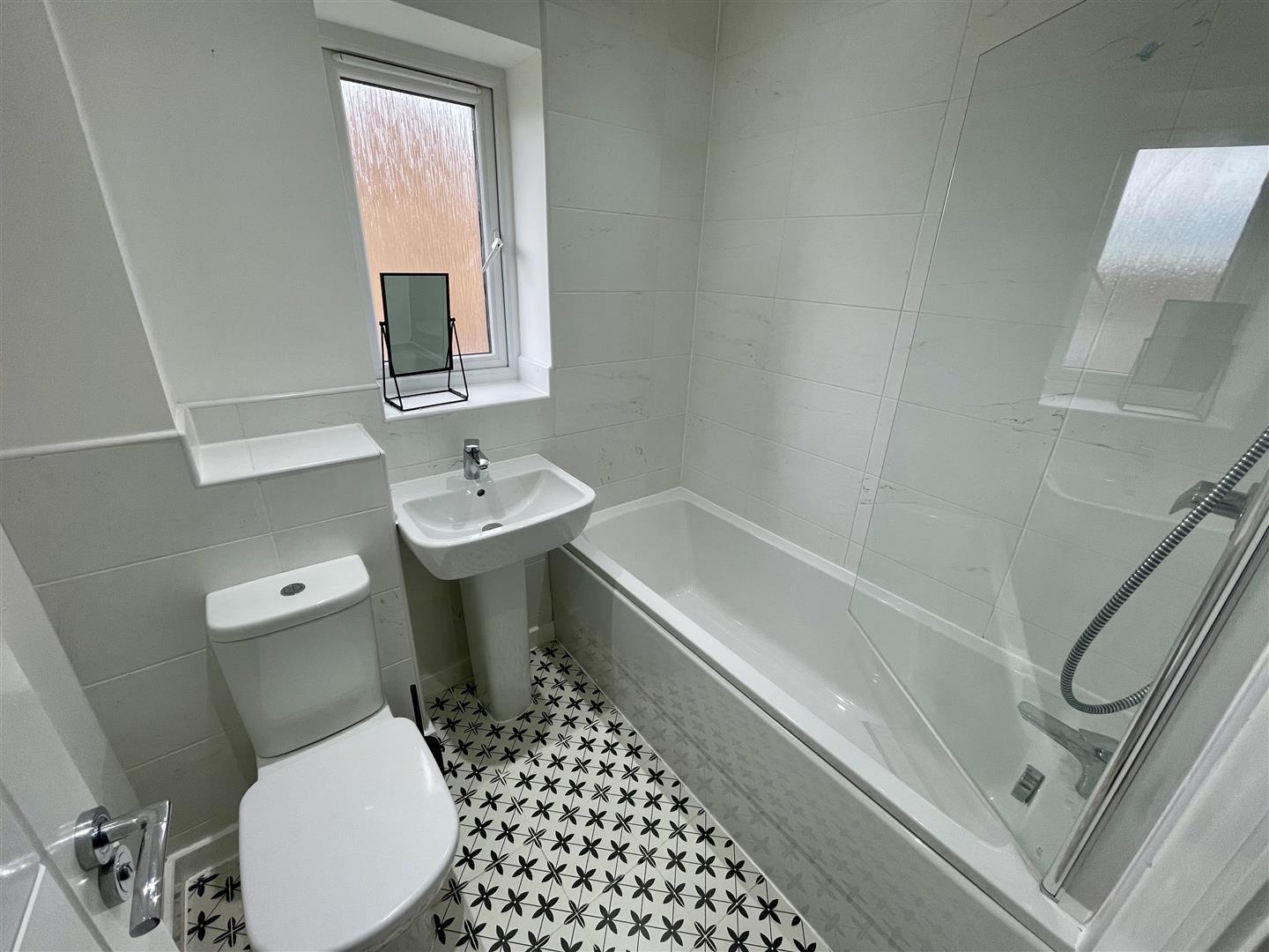 Upvc double glazed obscure window to rear, fitted panelled bath with shower over and screen. Wash hand basin. w.c and heated towel rail.