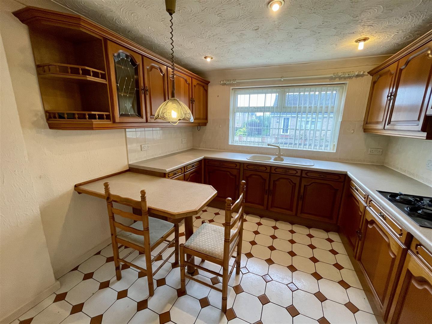 Upvc double glazed window to front, coving to ceiling, fitted with wall, base and drawer units including glass fronted display cabinet and tiled splashbacks. Sink with mixer tap, four ring gas hob with extractor over and eye level double oven. There is a fixed to wall table surface with seating. Space for a fridge freezer, spotlights to ceiling and tiled floor.