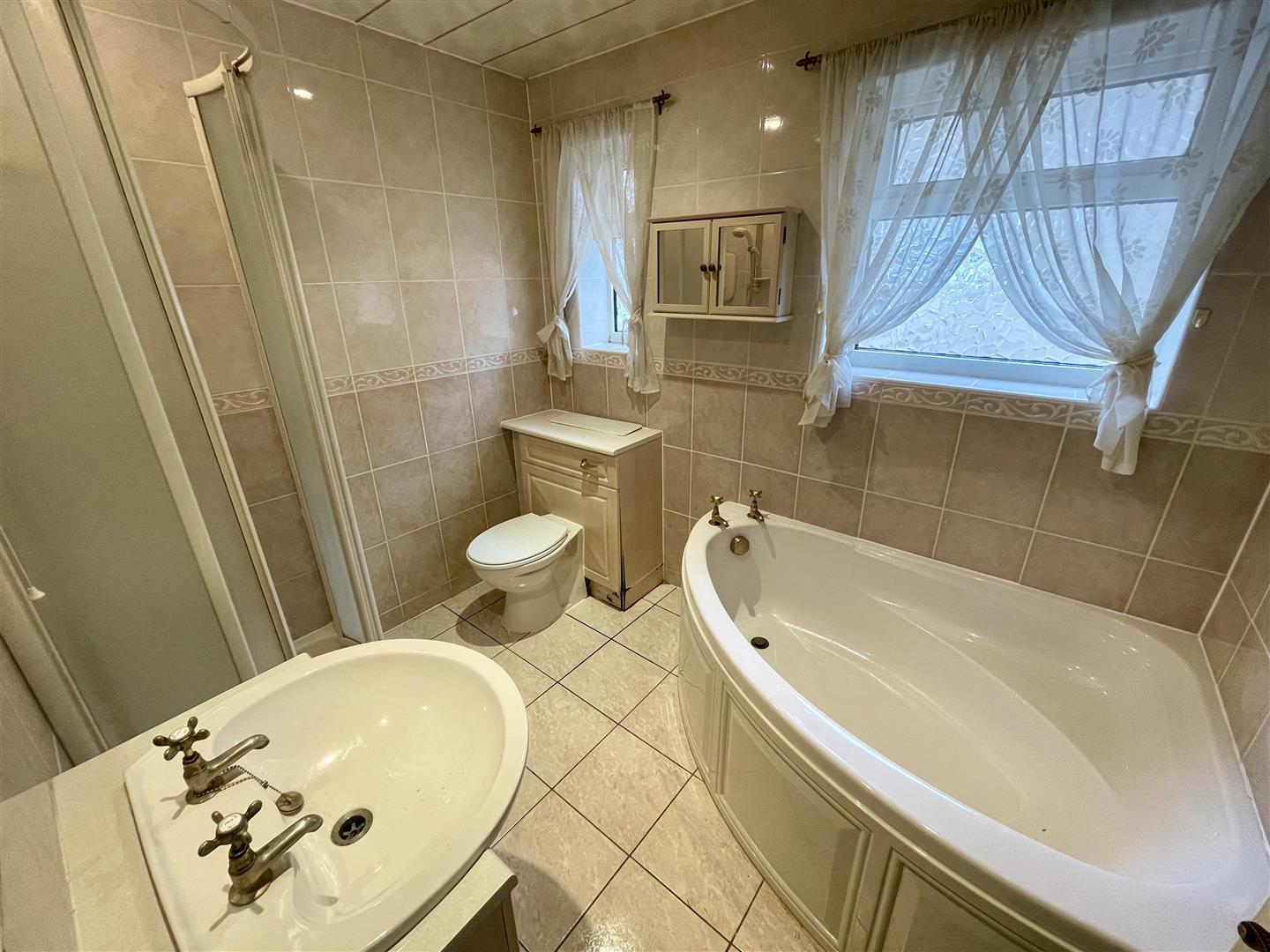 Two Upvc double glazed obscure windows to side, fitted corner bath, walk in shower cubicle, wash hand basin in vanity unit and w.c. Tiled walls and floor with heated towel rail.