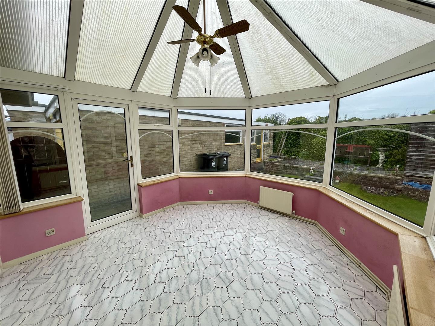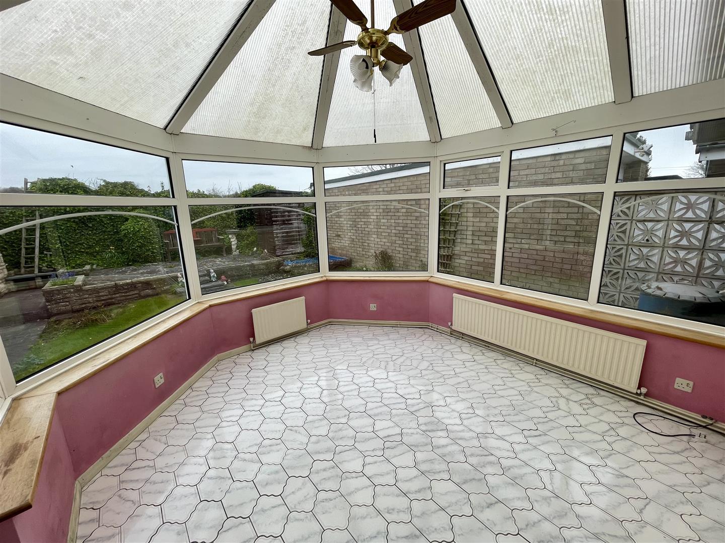 Half wall, half Upvc double glazed with apex roof and ceiling fan. Three radiators, tiled floor and door to rear garden.