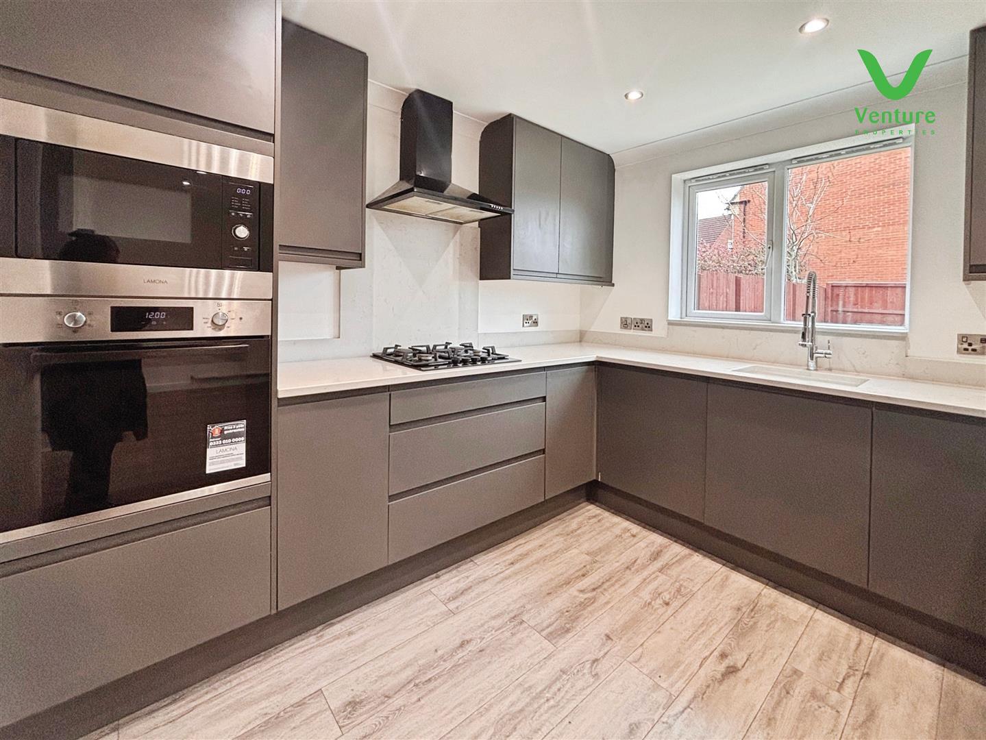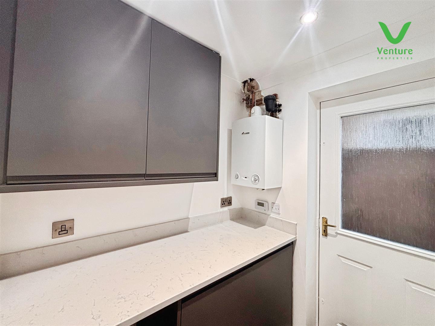 With base units, granite working surfaces, , wall mounted gas boiler, plumbing and space for washing machine, space for tumble dryer, central heating radiator and rear entrance door
