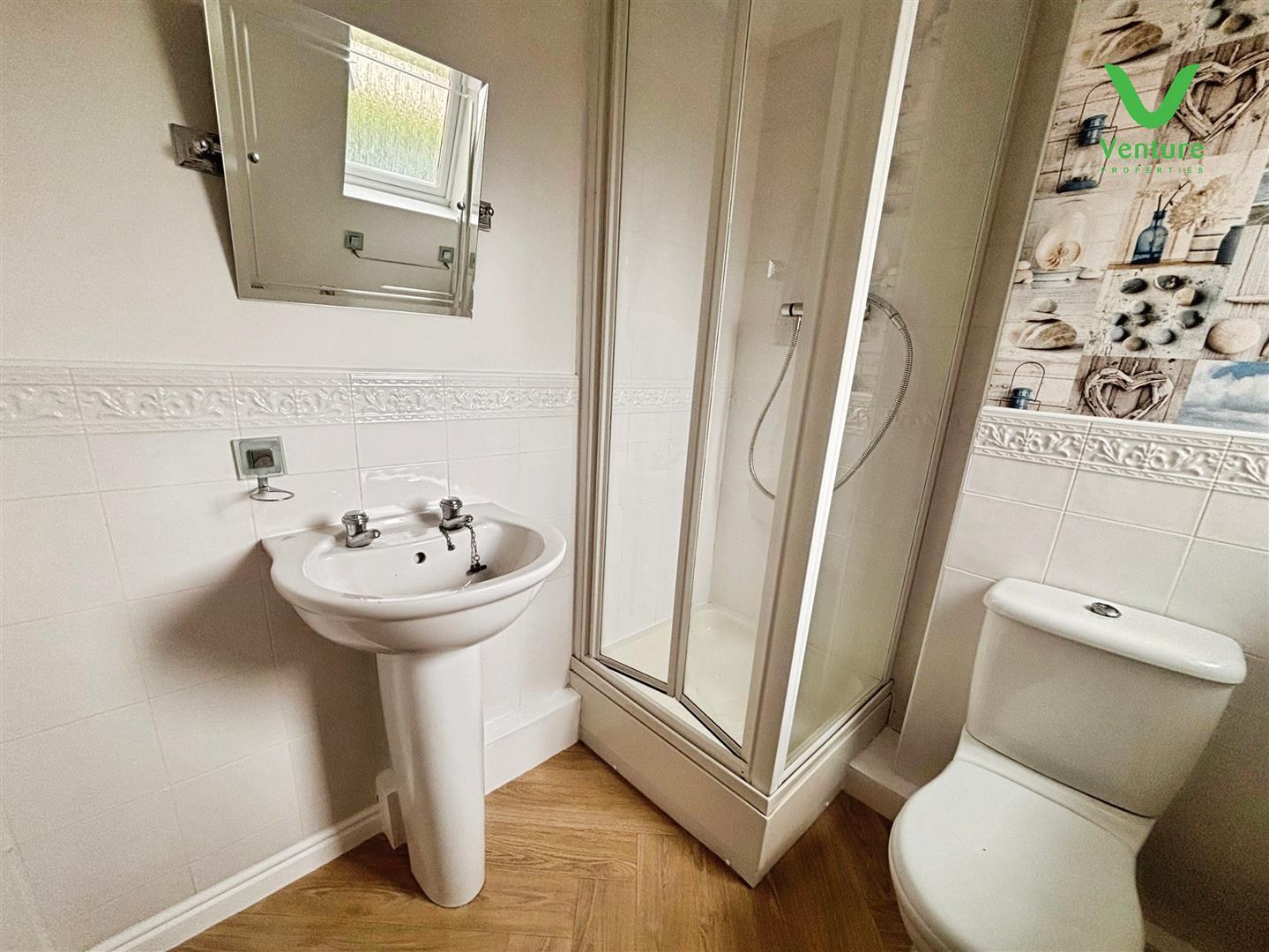 Extensively fitted with a white suite including corner shower cubicle , wc, wash hand basin , tiled splash backs, opaque UPVC double glazed window and central heating radiator