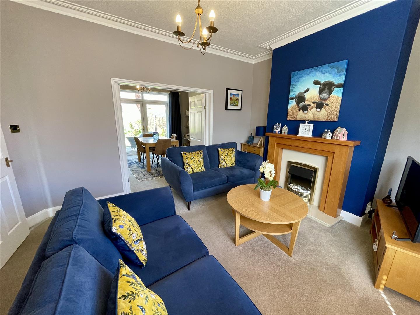 Upvc double glazed bay window to front, decorative coving to ceiling, fireplace with marble back and hearth, inset electric fire, and radiator. Double doors to dining room.
