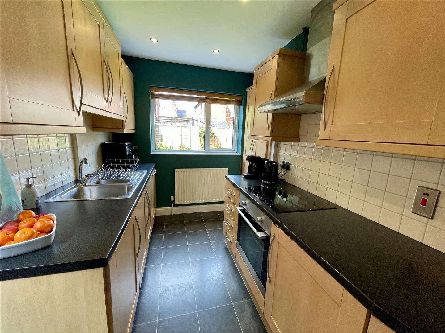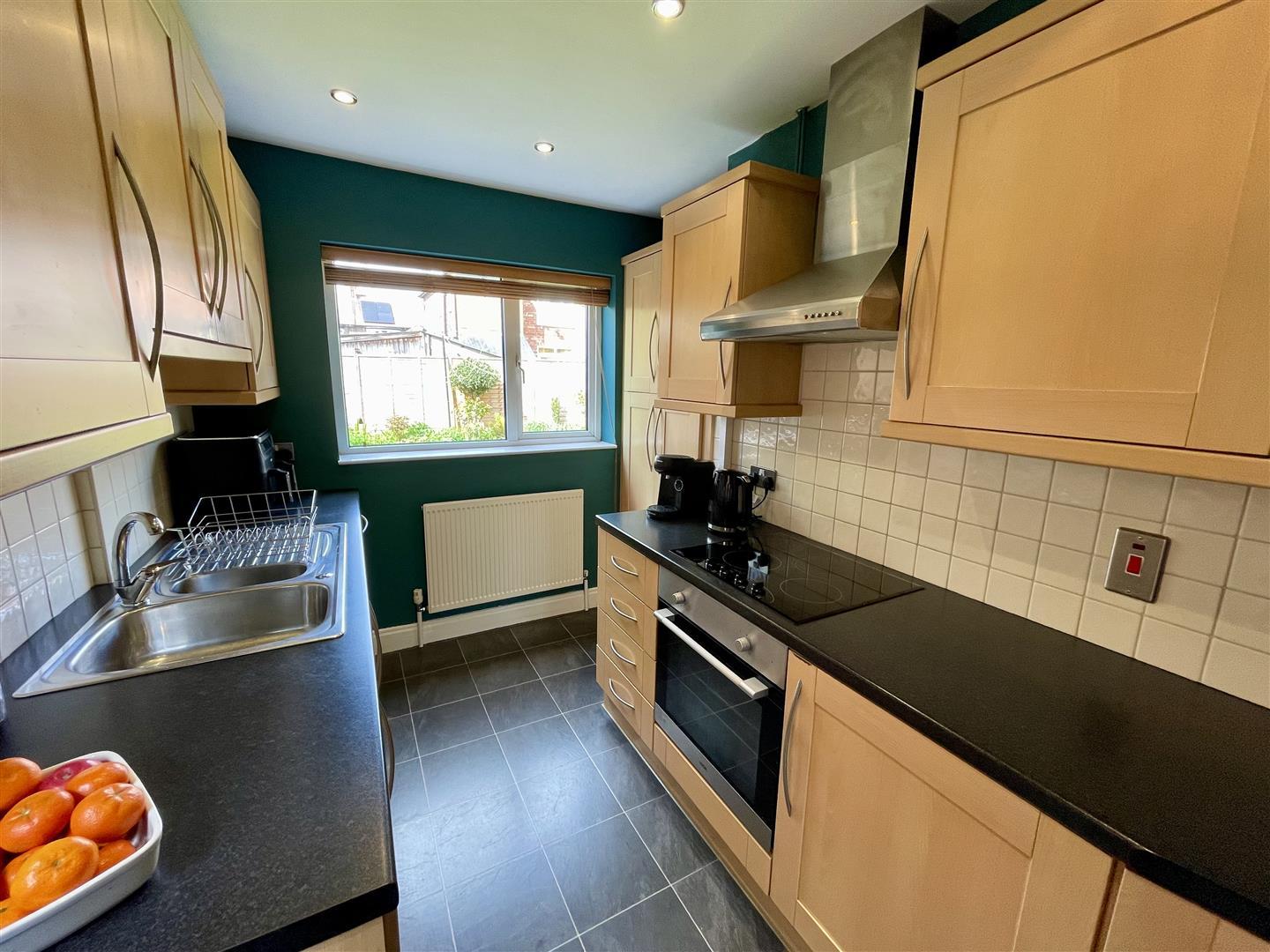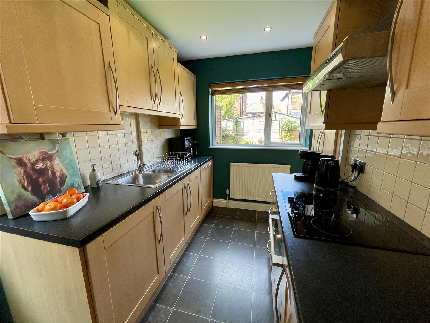 Upvc double glazed window to rear, fitted with wall, base and drawer units, electric hob and oven with extractor over. Stainless steel sink with mixer tap, integrated fridge and washing machine. Upvc door to side, part tiled walls and spotlights to ceiling.