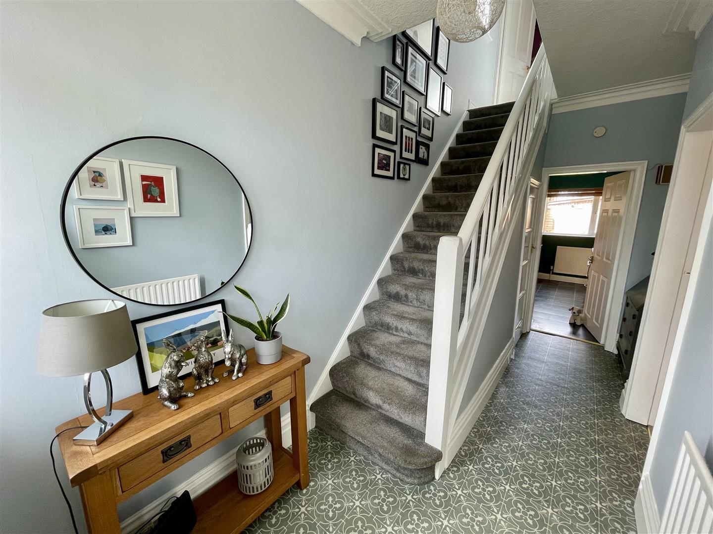 Composite door to front, staircase to first floor landing, under stairs storage cupboard under, decorative coving to ceiling and radiator.