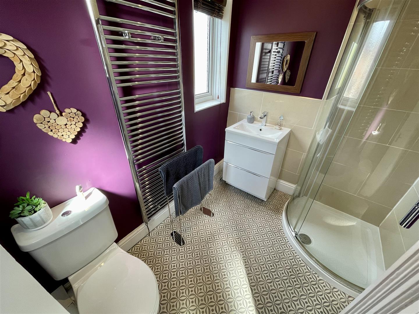 Upvc double glazed obscure window to rear, walk in shower cubicle, wash hand basin in vanity, low level w.c and heated towel rail. Part tiled walls.