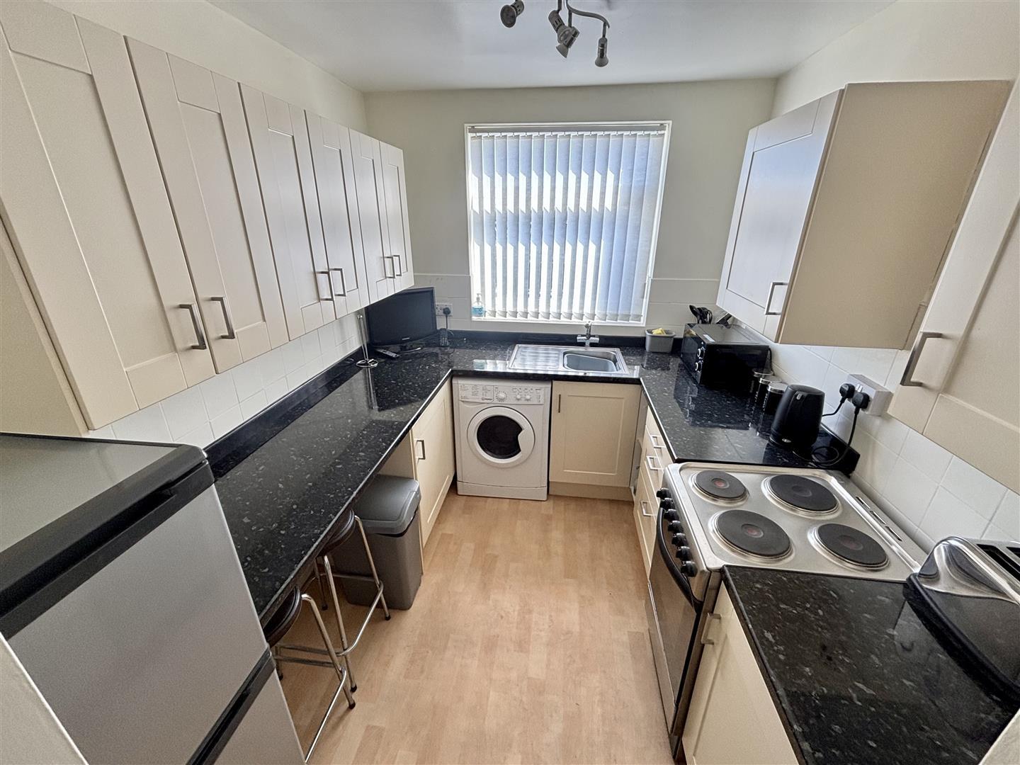 Fitted with a range of wall and floor units having contrasting worktops incorporating a stainless steel sink and drainer unit with mixer tap, an electric cooker, a fridge/freezer space and plumbing for a washing machine. Further features include a UPVC double glazed window to the rear and tiled splashbacks.