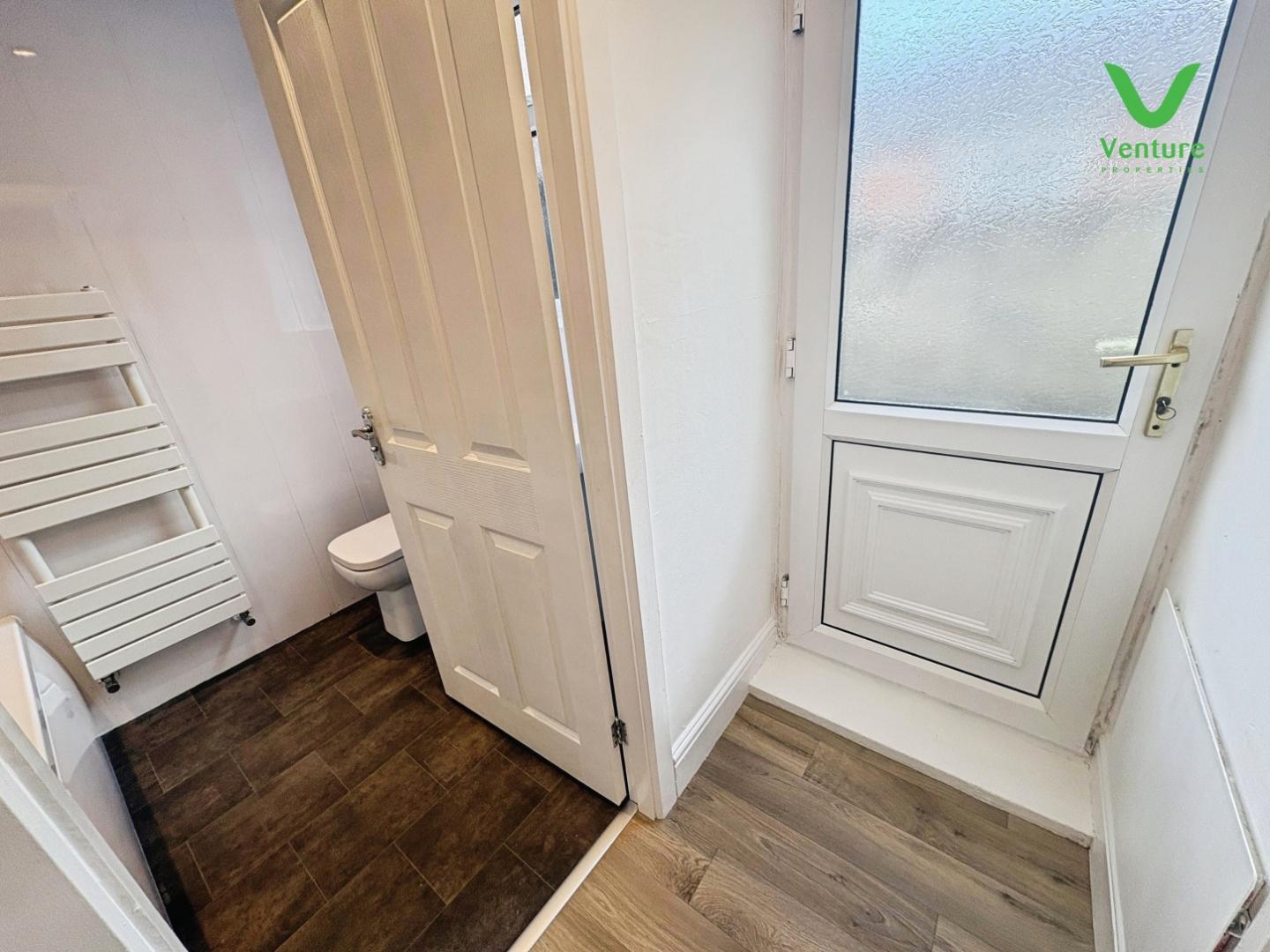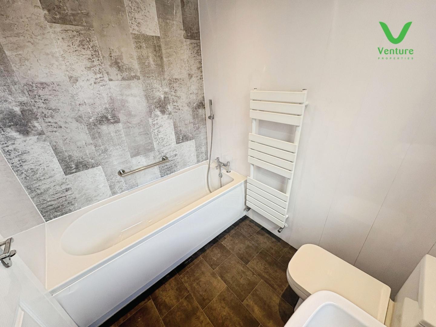 Fitted with a white suite including panelled bath with hand shower over, wc, pedestal wash hand basin, heated towel rail, opaque UPVC double glazed window