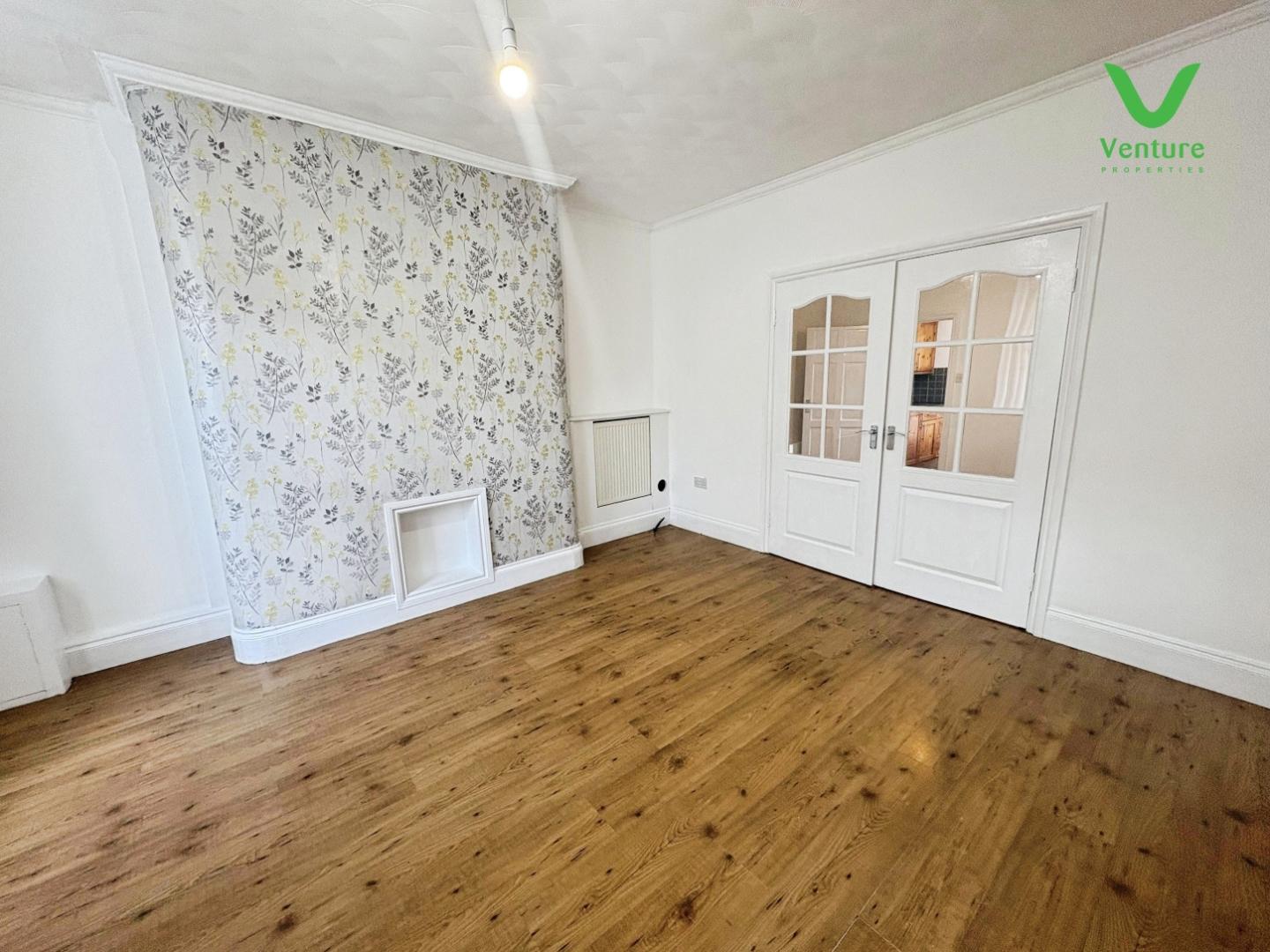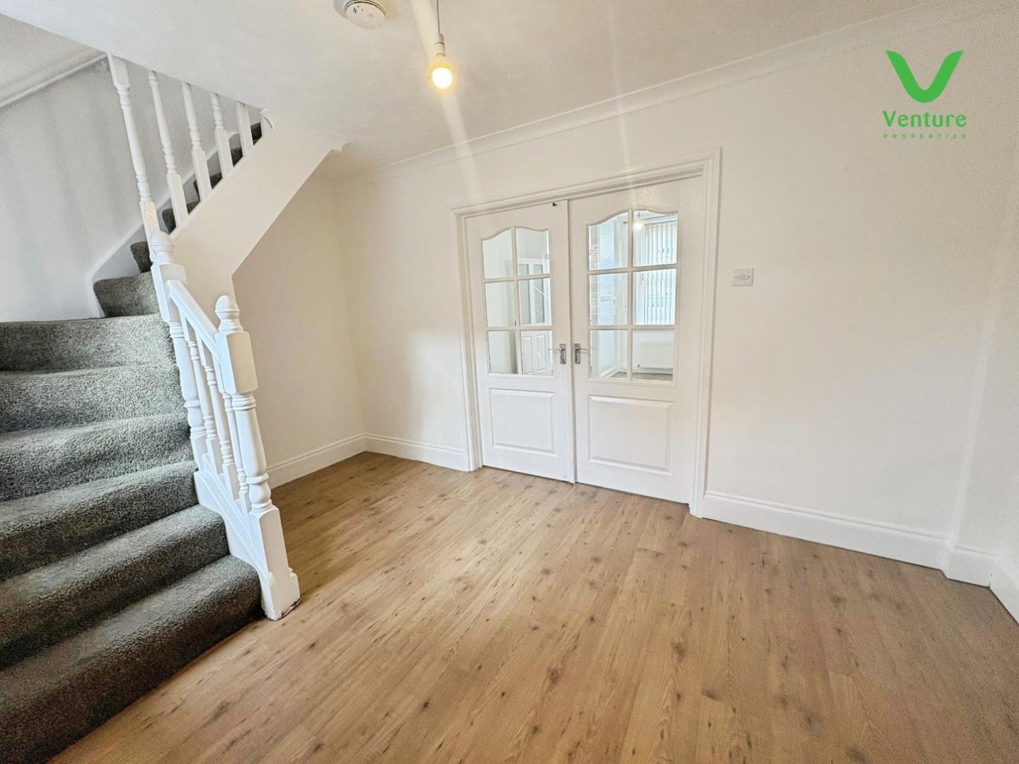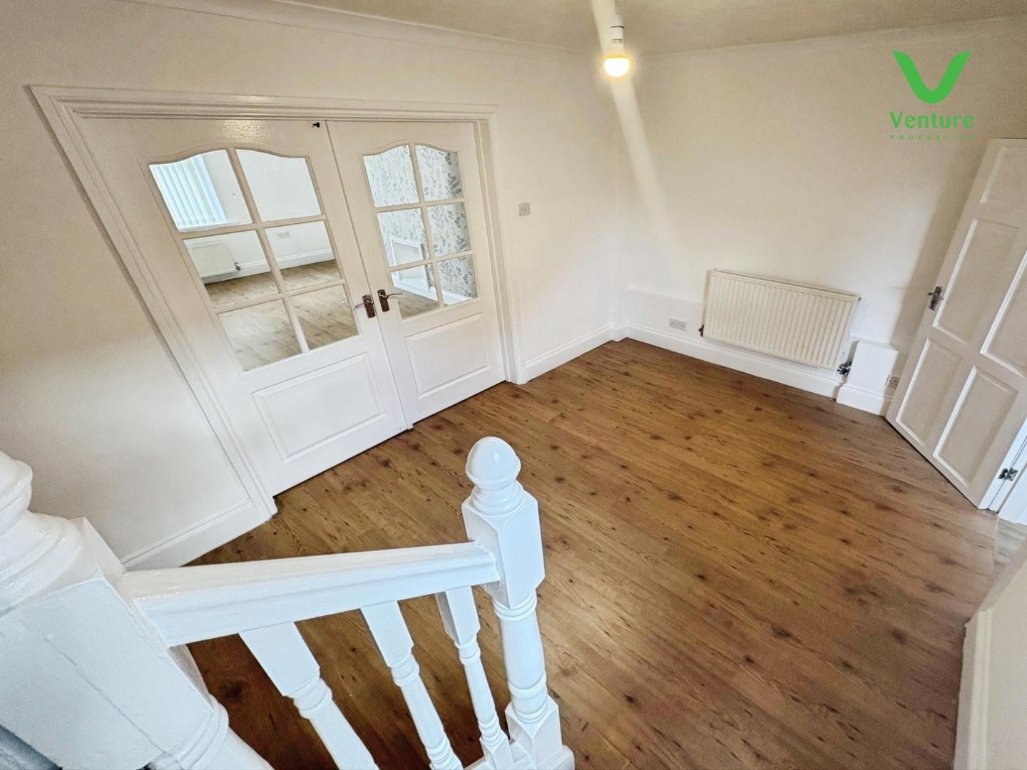 UPVC double glazed window to the front elevation, central heating radiators, laminated floor, double timber and glazed doors through to