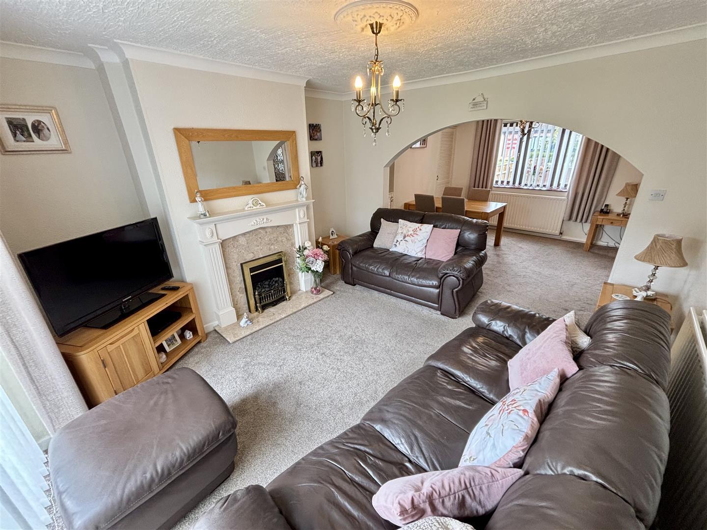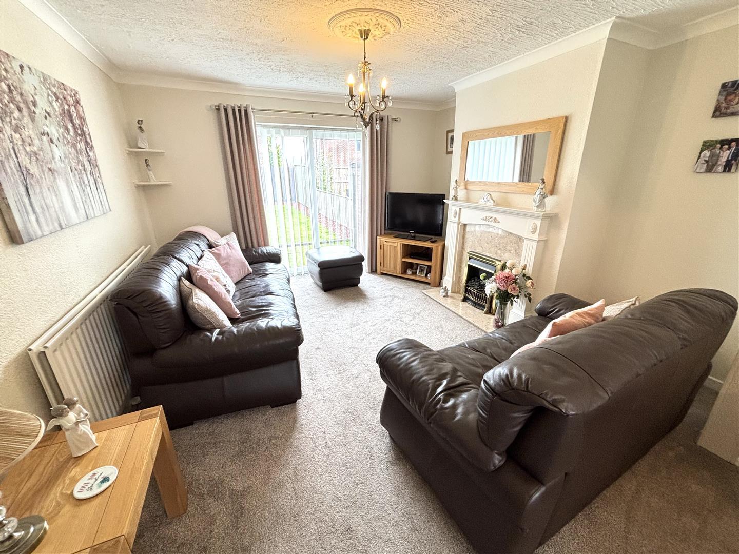 Spacious reception room with patio doors to the rear garden, a feature fireplace housing an electric fire and radiator.