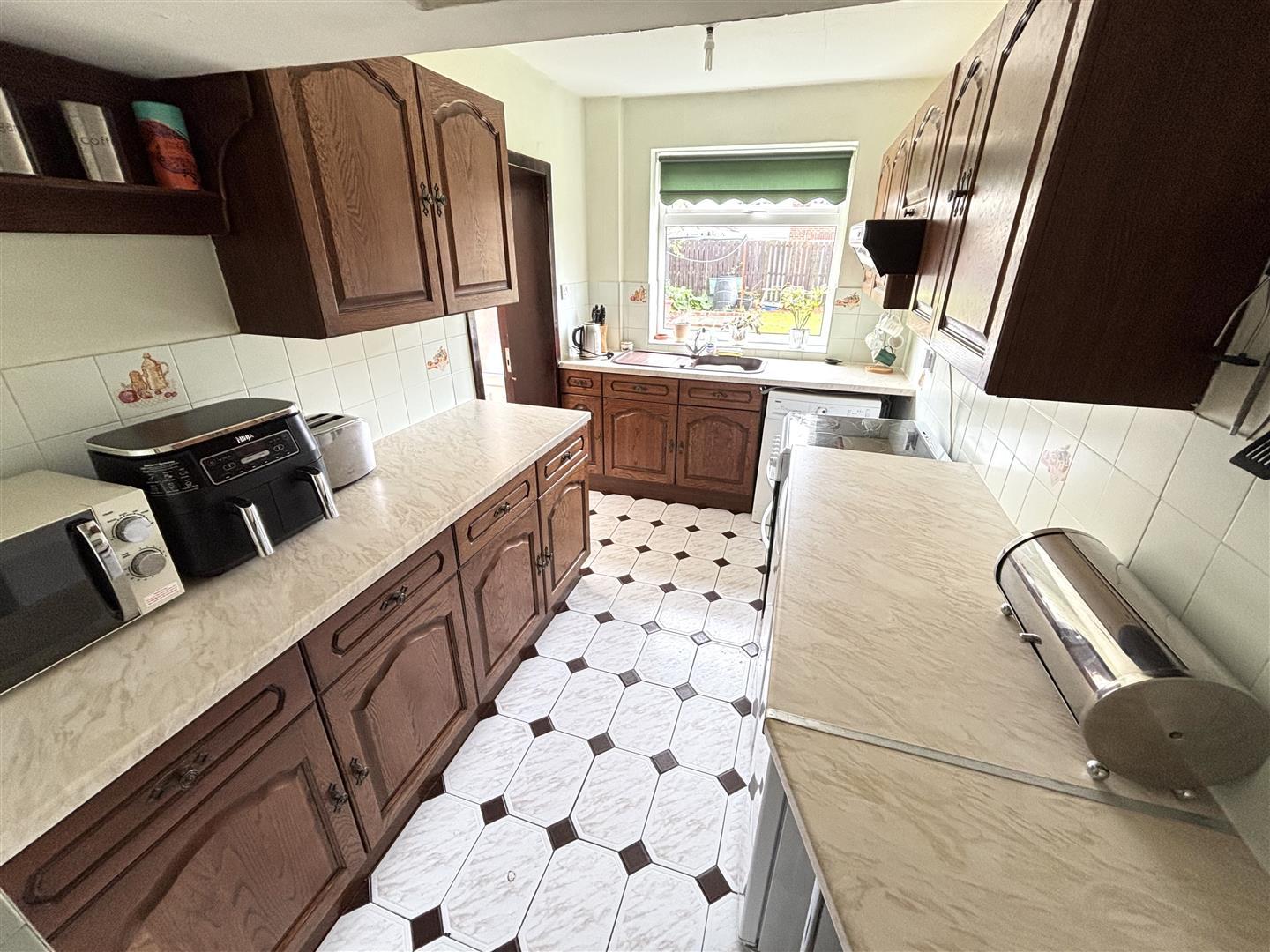 Fitted with a range of wall and floor units having contrasting worktops incorporating a sink and drainer unit with mixer tap, an electric cooker, plumbing for a washing machine, tiled splashbacks and flooring, a radiator and a UPVC double glazed window to the rear.