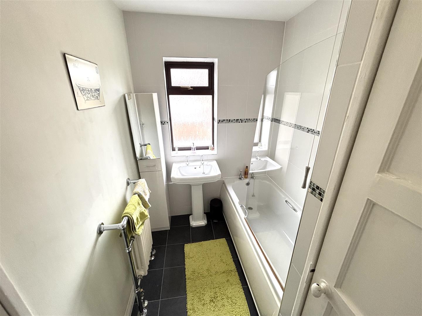 Fitted with a panelled bath with electric shower over, pedestal wash basin, heated towel rail, cupboard housing the combi gas central heating boiler and UPVC double glazed opaque window to the side.