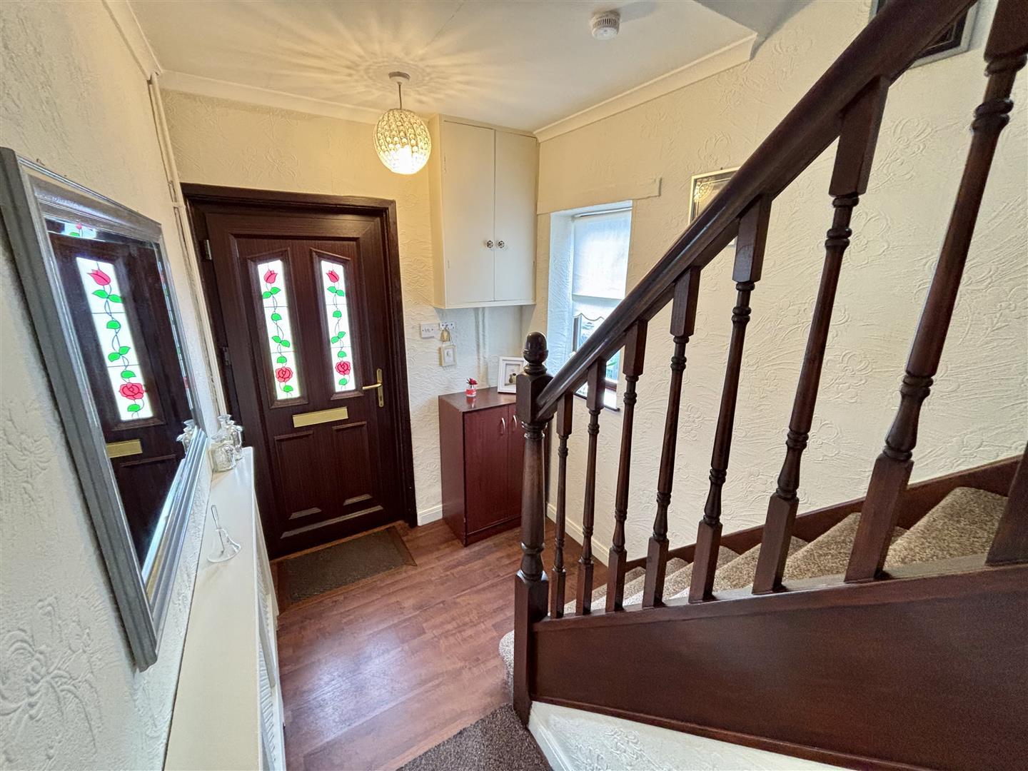 Welcoming hallway entered via UPVC double glazed door. With stairs leading to the first floor, UPVC double glazed window to the side, laminate flooring and a radiator.