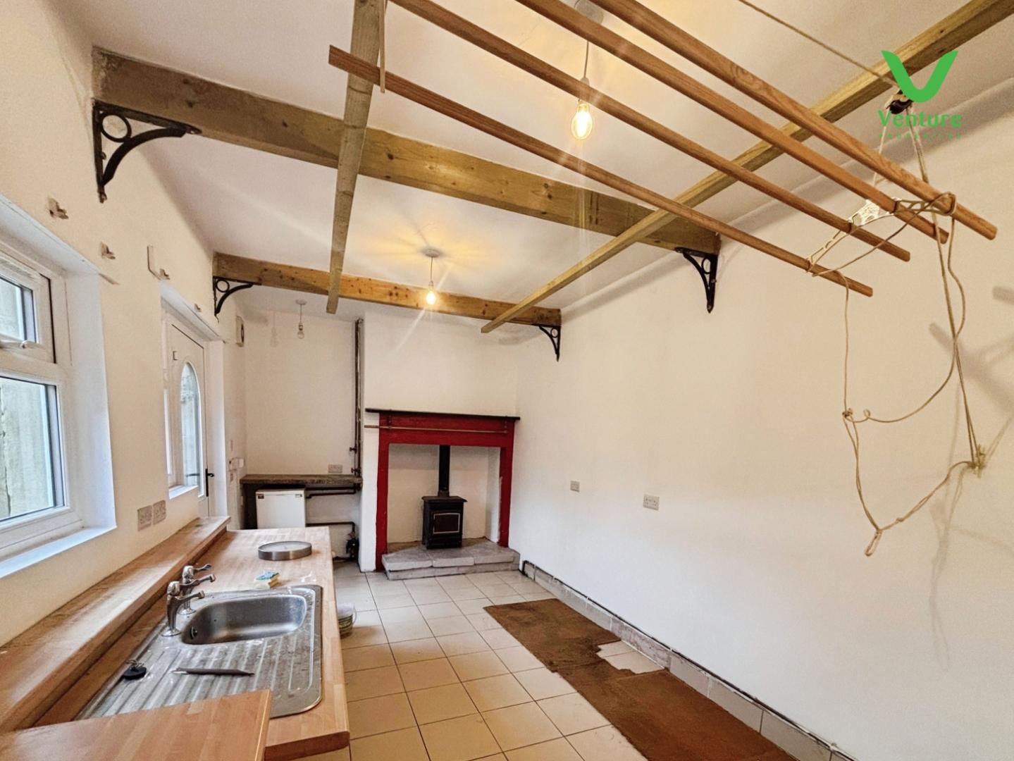 Fitted with a wirk surface and drawers, stainless steel sink unit, oil central heating boiler, feature inglenook fireplace housing log burning stove and uPVC double glazed windows and door to rear.
